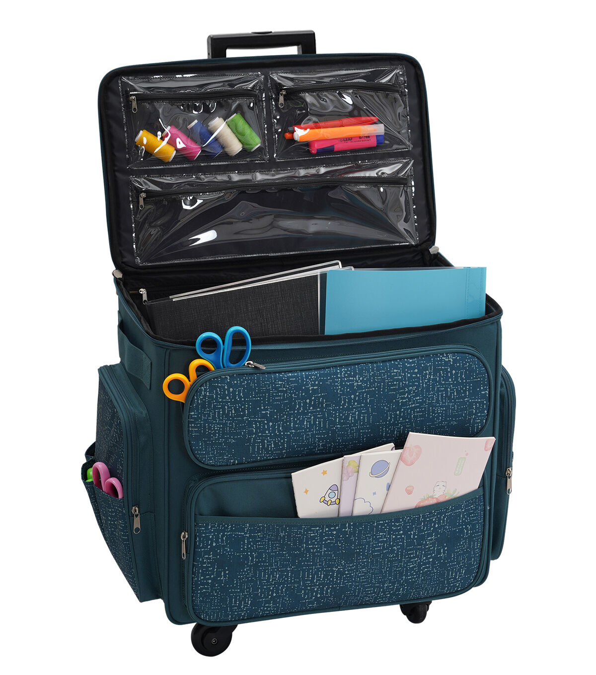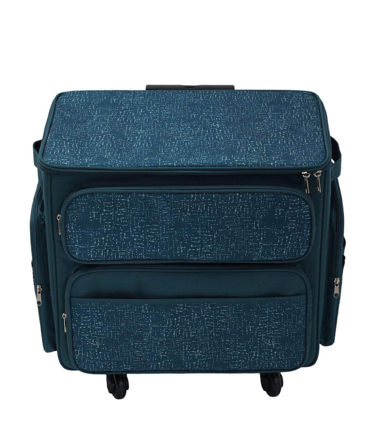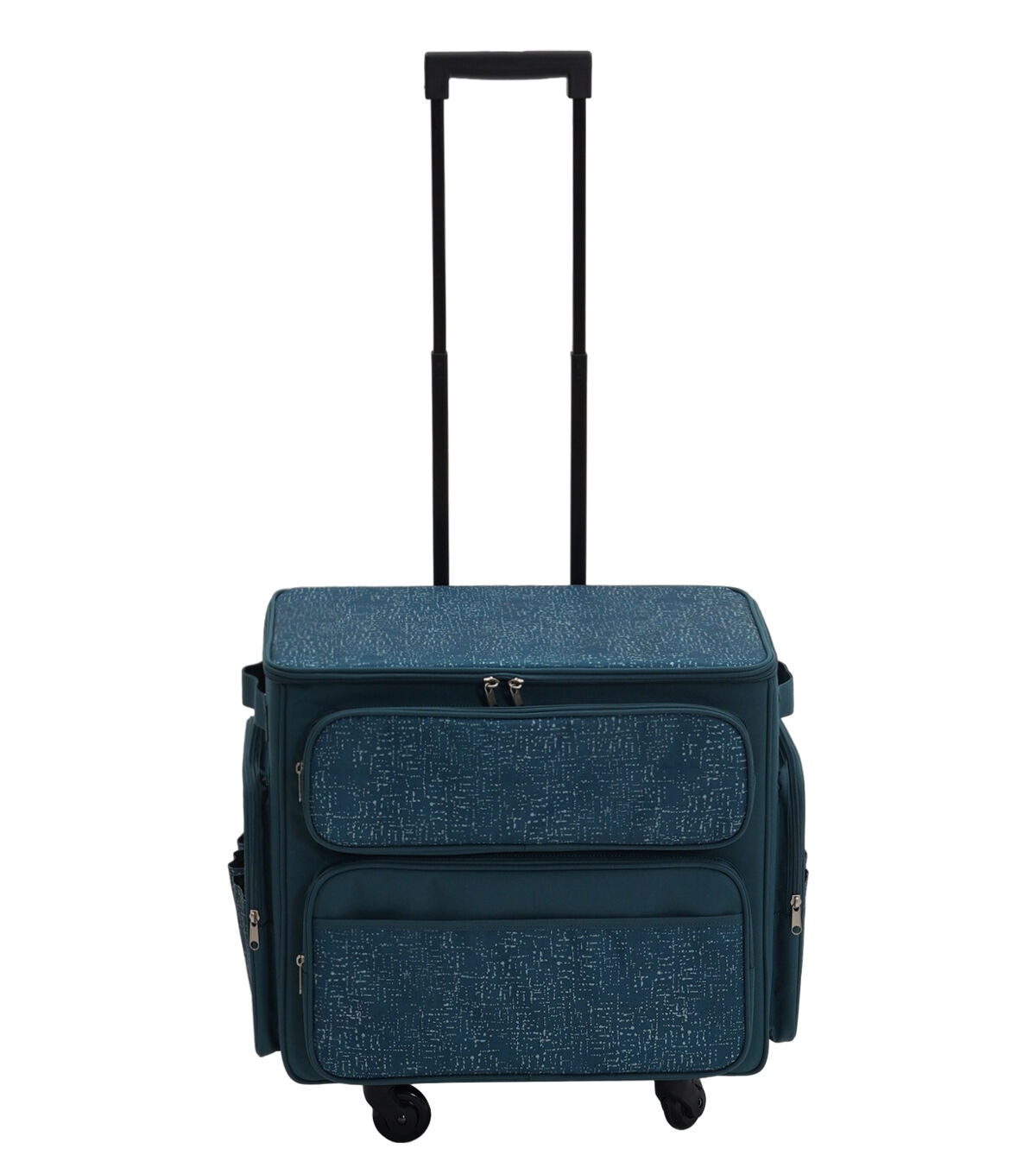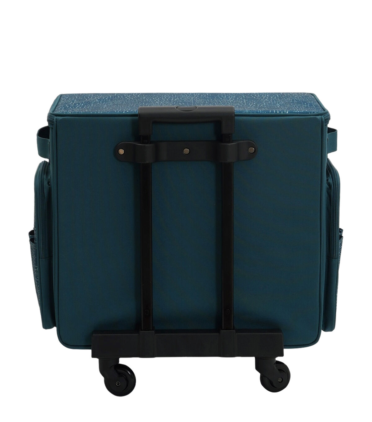 Keep your sewing machine and essentials safe in the Teal Rolling Sewing Machine Storage Tote by Top Notch. This rolling storage tote sports a teal shade and an interesting pattern. It is designed with transparent slots on the underside of the flap, side handles and zipper pockets. The telescopic handle will make moving it a breeze.