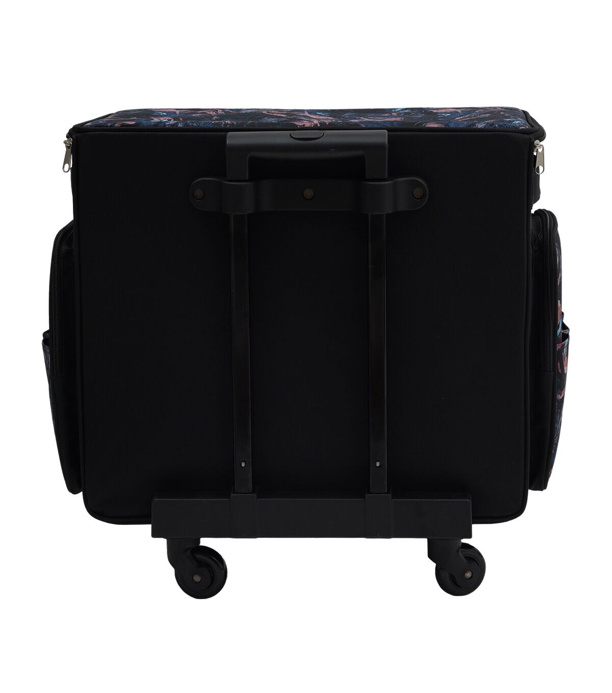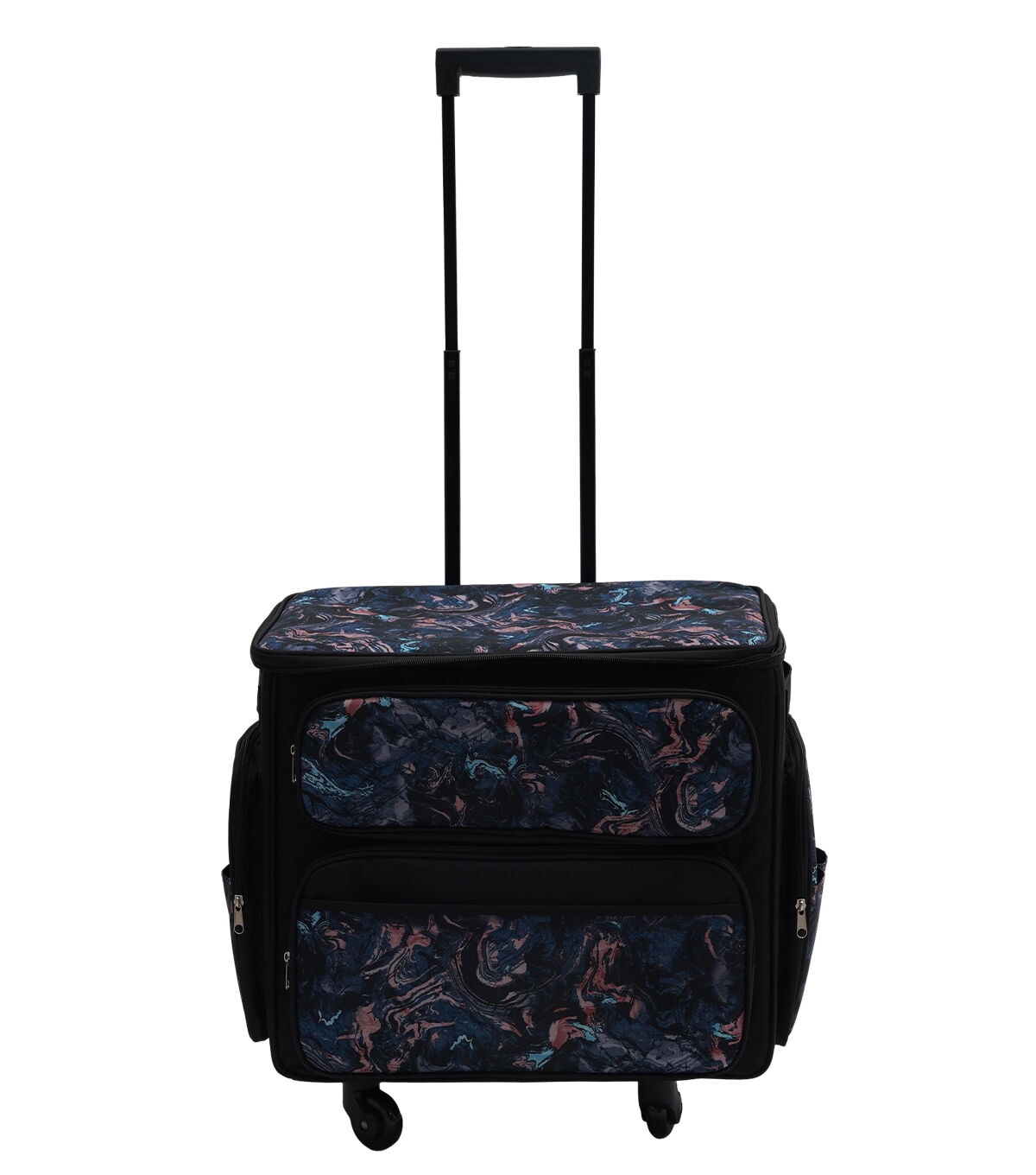 The Blue Marbled Rolling Sewing Machine Storage Tote by Top Notch is just what you need to carry your sewing machine when you're on the go. This rolling storage tote flaunts a marbled pattern in lovely hues and is designed with a telescoping handle. It comes with pockets to keep sewing notions, trims, needles and other accessories you might need for your projects.