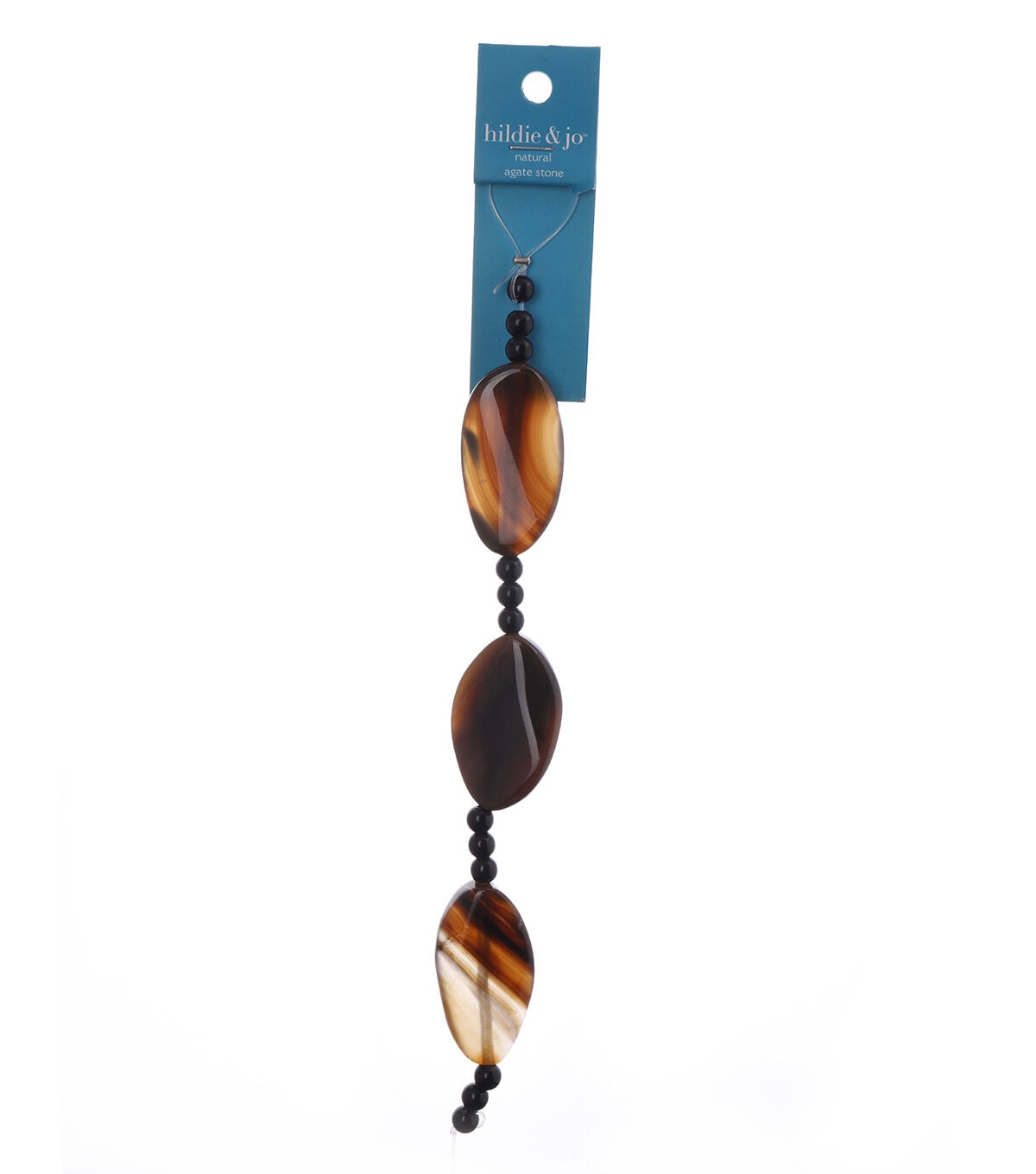 The hildie & jo Oval Agate Stone Bead Strand - Multi is perfect for designing statement bracelets, neckpieces, earrings and more. This pack of highly polished strung agate ovals comes with an intriguing mix of colors. Each oval measures 20 x 40 x 7 mm. The strand also includes matching polished black spacer beads measuring 6 mm each. Combine them with beads, chains and other jewelry elements to make your own uniquely creative designs.