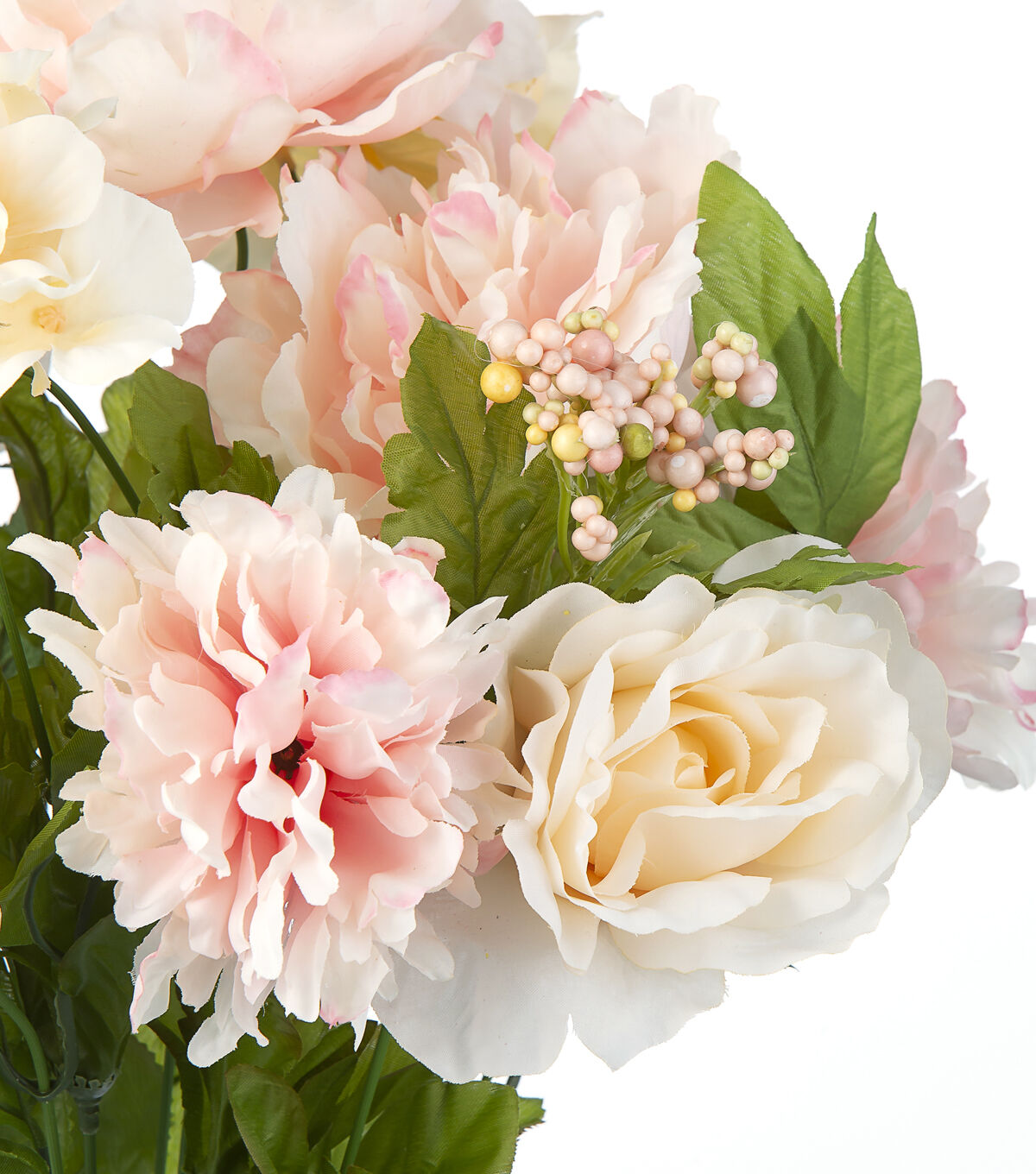 The Bloom Room Peony, Rose & Hydrangea Mixed Bush will make the perfect gift for someone who loves flowers. It displays a stunning combination of roses, peonies and hydrangeas in lovely pastel shades and leaves. You can also display this faux bush on your mantel or entryway table by adding it to a ceramic vase.