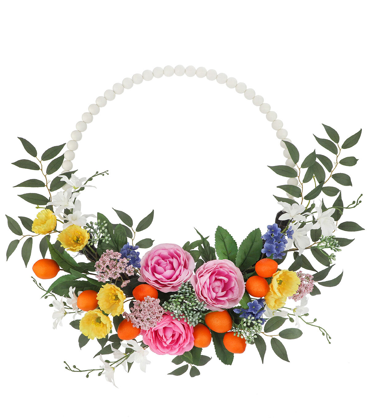 The Spring Asymmetrical Kumquat & Ranunculus Wreath by Bloom Room will make a gorgeous addition to your home decor this spring. Faux ranunculus blooms, poppies, kumquats and orchids in beautiful colors are arranged on the lower part of this stunning asymmetrical wreath. It is adorned with white beads on the top. Use it to decorate the front door, mantel or entryway wall.