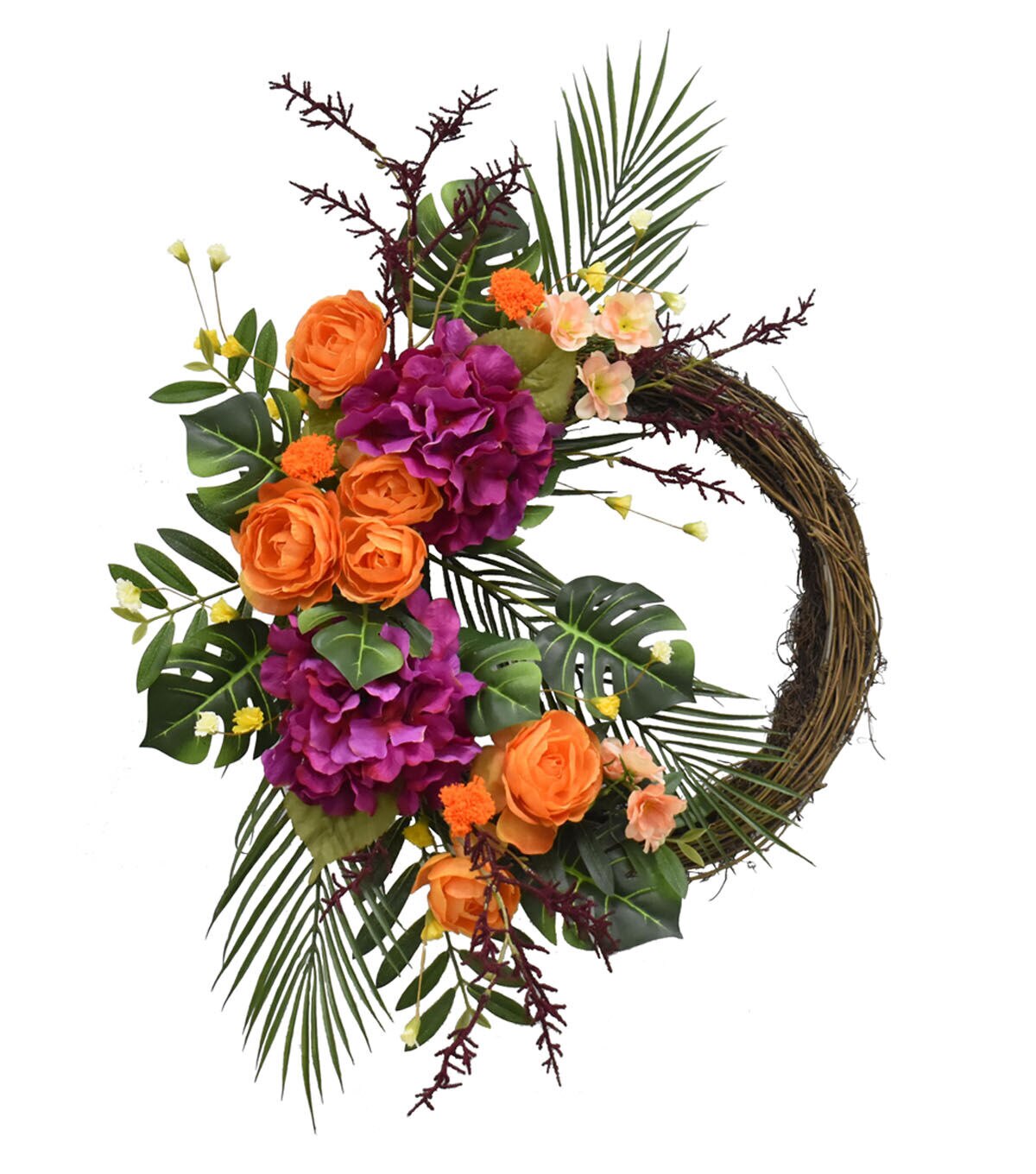 Add a unique touch to your summer decor with the Summer Hydrangea & Ranunculus Wreath by Bloom Room. This faux wreath consists of a lush arrangement of hydrangeas, ranunculus and leaves in gorgeous shades. You can display it above the mantel, on a window frame or on any wall. Accent it with a bow and fairy lights for enhanced visual charm.