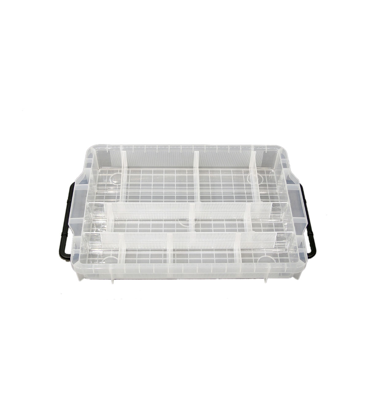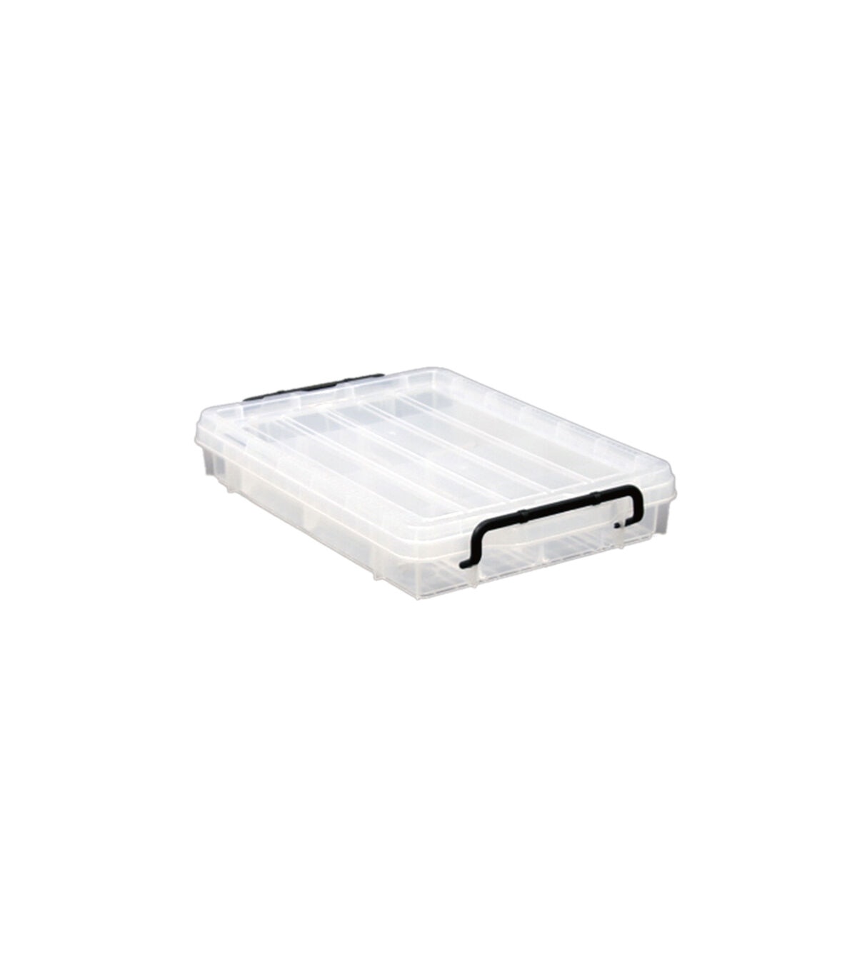 Storage container with 2 levels gives you room to neatly store and organize your crafting tools and small supplies, while also providing a spacious bottom compartment for storing larger materials and more. The clear body and lid make it easy to see what's inside the container without opening it up, and when not in use, stacks neatly with other containers of the same size. Can also be stacked together with Durable Stacker 45 Large Tall. Features two latches to keep lid and upper container in place and secured when not in use. Comes with 2 extra large, 3 medium and 6 small dividers. The extra large dividers may be readjusted to 3 different positions, while the medium and small dividers can be adjusted to a multitude of positions to best fit your needs. Dividers can only be used in the upper container.