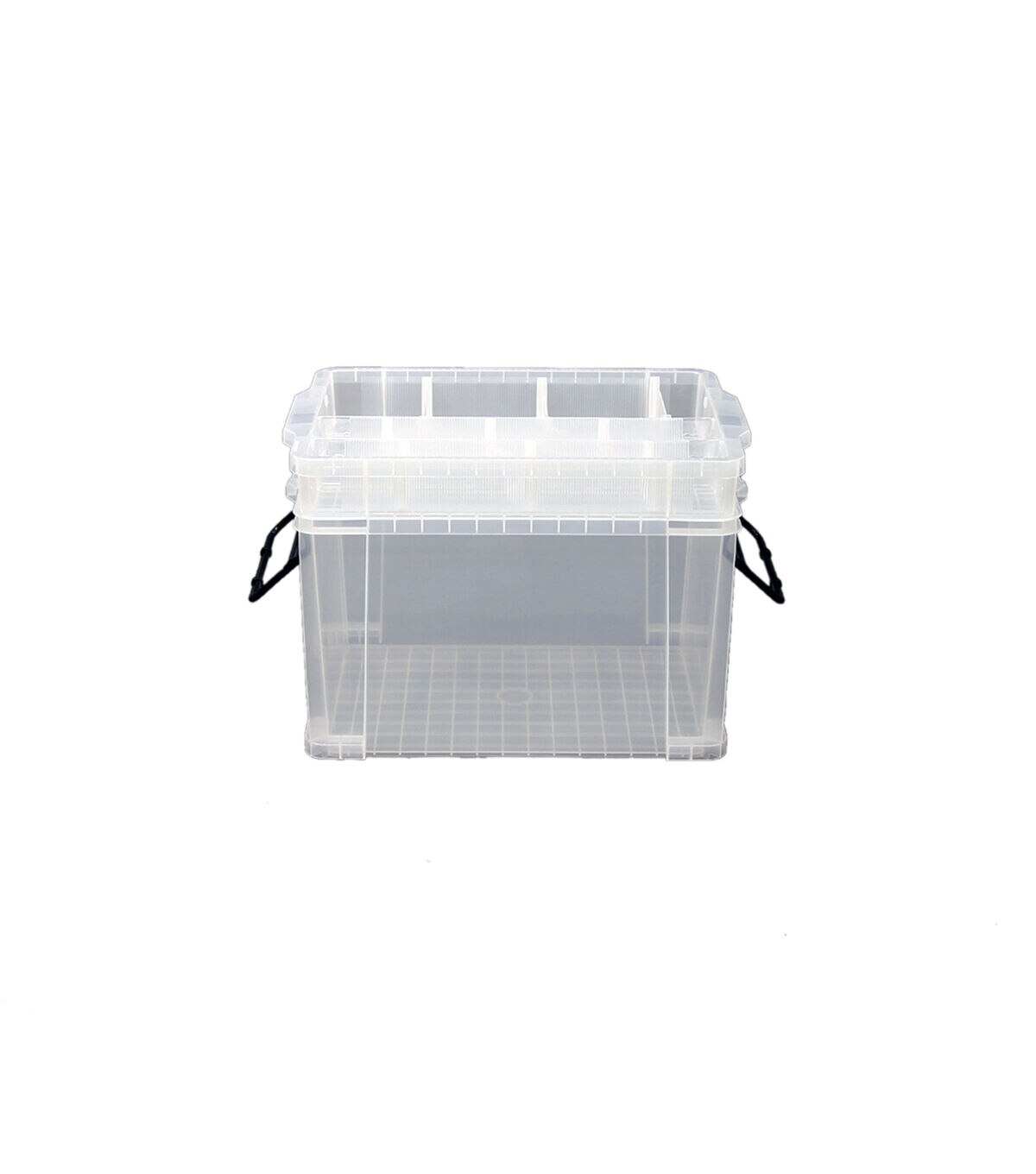 Storage container with 2 levels gives you room to neatly store and organize your crafting tools and small supplies, while also providing a spacious bottom compartment for storing larger materials and more. The clear body and lid make it easy to see what's inside the container without opening it up, and when not in use, stacks neatly with other containers of the same size. Can also be stacked together with Durable Stacker 22 Large Shallow. Features two latches to keep lid and upper container in place and secured when not in use. Comes with 2 extra large, 3 medium and 6 small dividers. The extra large dividers may be readjusted to 3 different positions, while the medium and small dividers can be adjusted to a multitude of positions to best fit your needs. Dividers can only be used in the upper container.