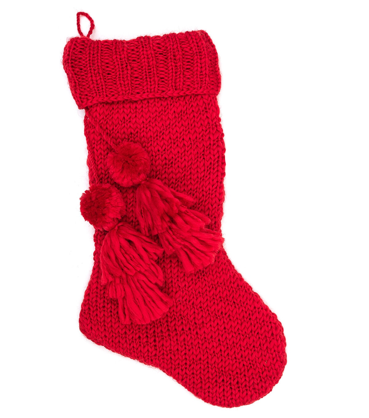 Add more colors to your holiday decor with the Christmas Knit Stocking With Pom Poms by Place & Time. Pom poms and tassels lend it the perfect finishing touch. Add it to a stocking holder on the mantelshelf. Team it with stockings in other festive hues, sold separately, for a visual flair.