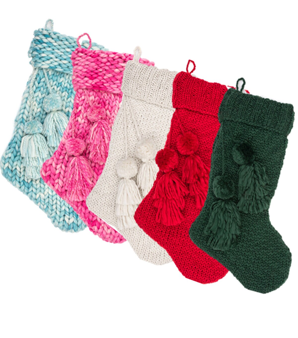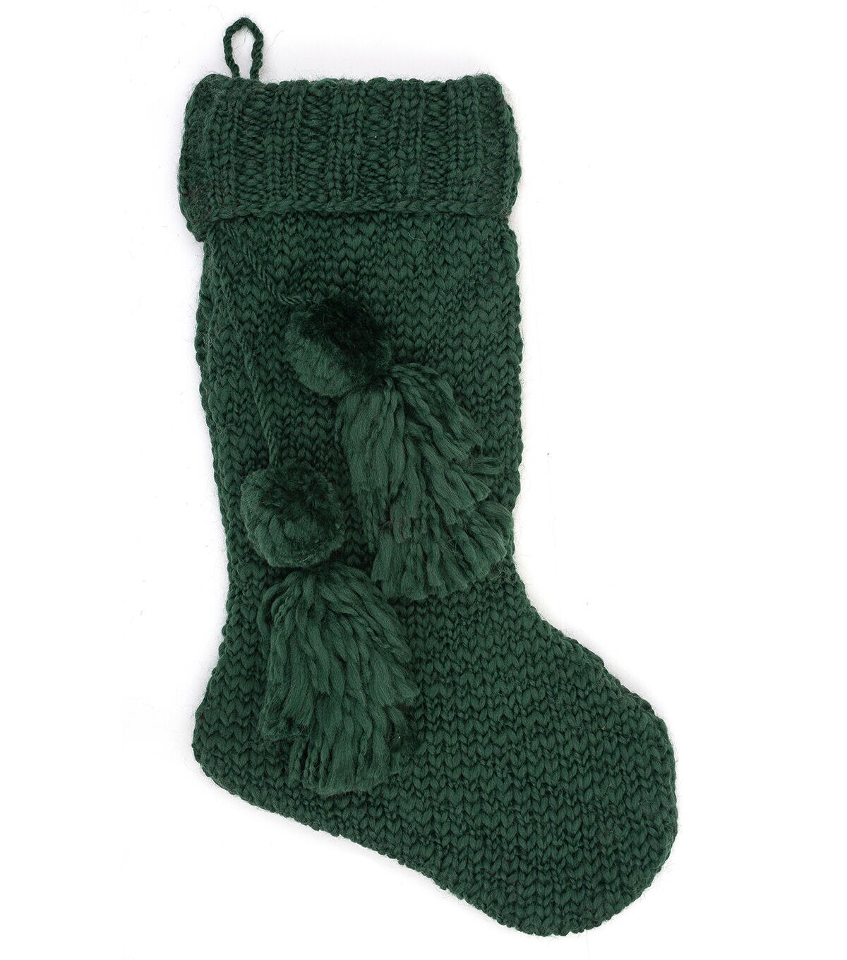 Add more colors to your holiday decor with the Christmas Knit Stocking With Pom Poms by Place & Time. Pom poms and tassels lend it the perfect finishing touch. Add it to a stocking holder on the mantelshelf. Team it with stockings in other festive hues, sold separately, for a visual flair.
