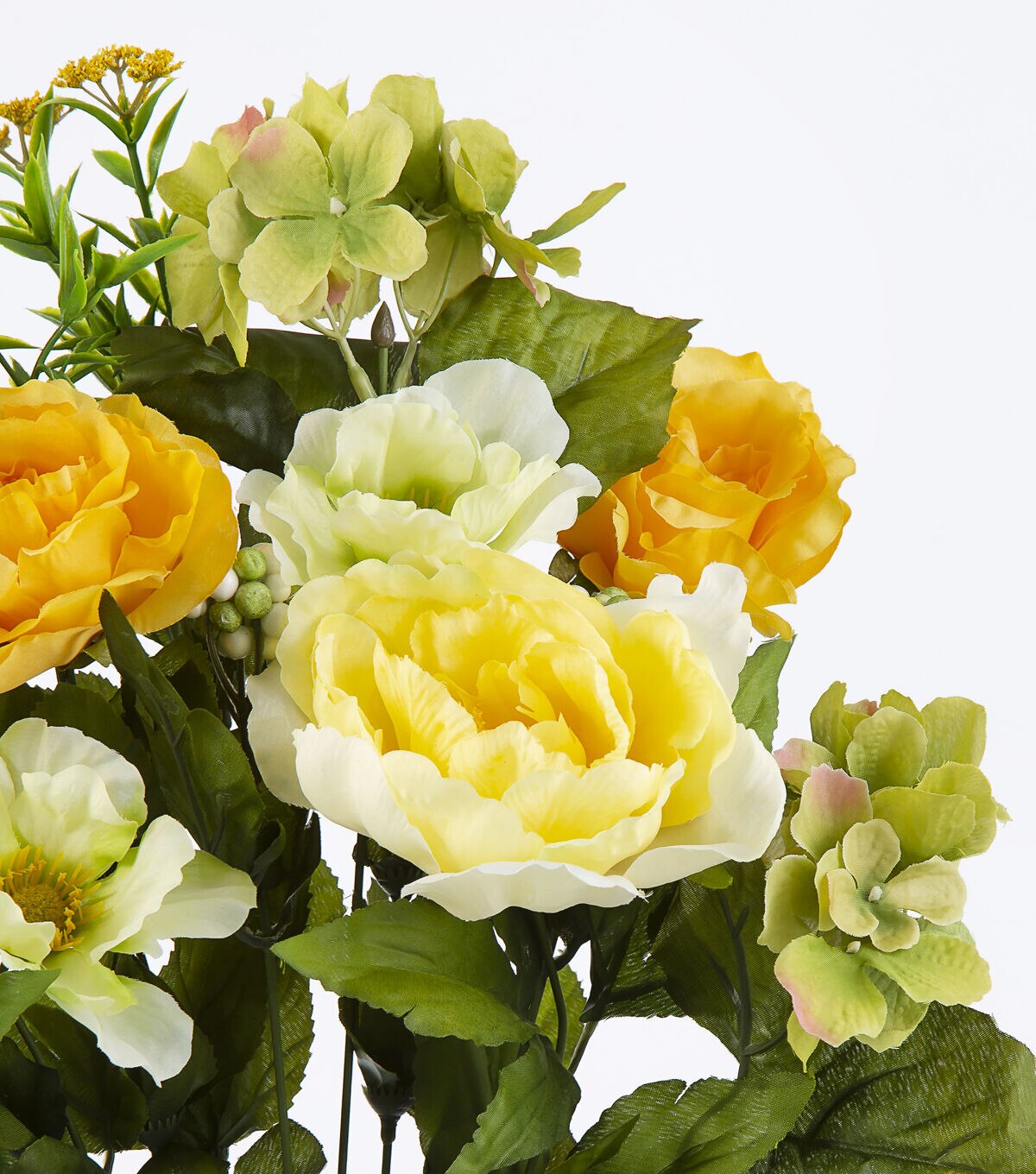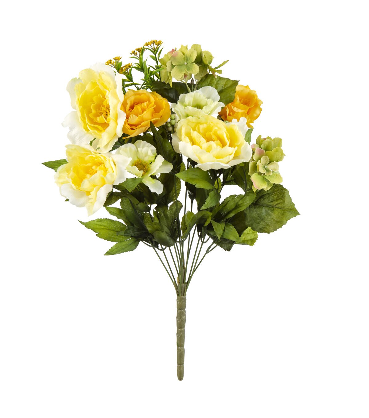 Add visual charm to any nook or corner of your home with the stunning Bloom Room Peony & Hydrangea Bush - Yellow & Cream. Pick a solid-colored bud vase to display this faux bush that is designed with peonies and hydrangeas sporting vivid yellow and soothing cream shades. You can also team it with colorful rose stems, each sold separately, to further amp up the beauty of your seasonal decor.
