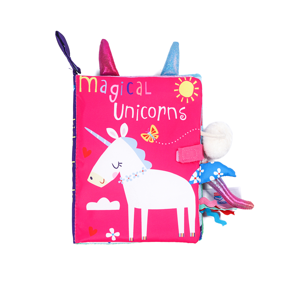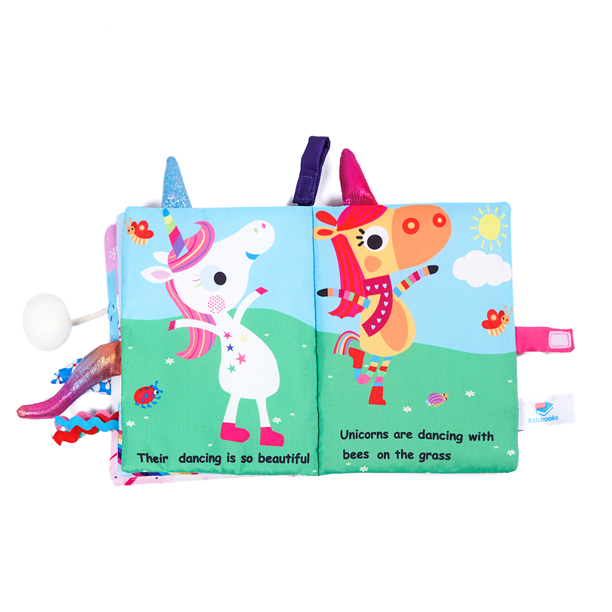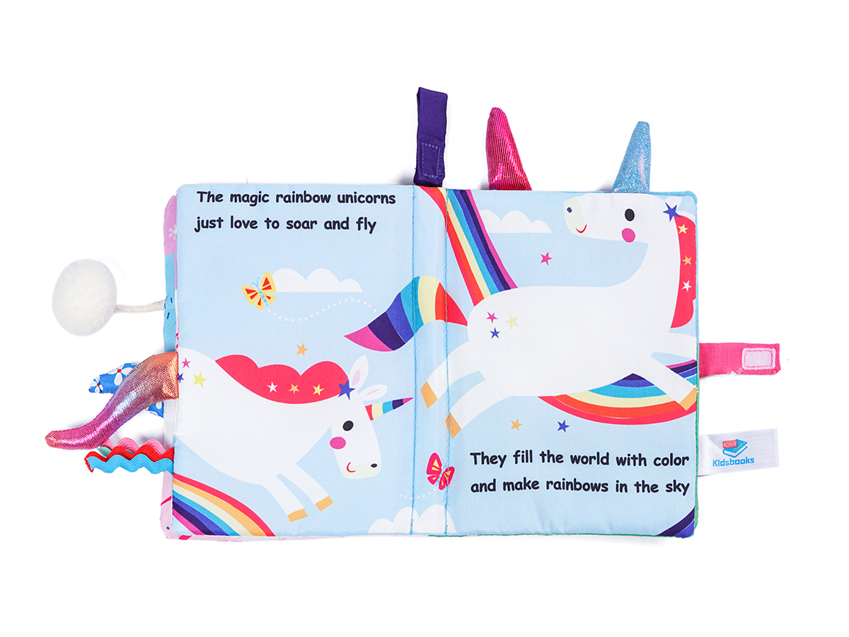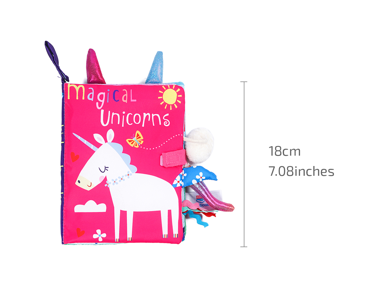This educational cloth book is a cute way for babies to learn things that are temporarily outside their reach. This Unicorn Cloth Book is a cute short story cloth book. Reading such cute and interesting cloth books together with your baby can not only providing fun when spending beautiful parent-child time with your baby but also enhance the baby's reading interest and hands-on ability. Your baby can learn things about their surrounding as they can touch and feel different materials and see several colorful patterns, also, this cloth book is filled in safe thin plastic slices, which will allow you to hear the sound when you turn the page, making it more appealing to babies than the normal paper book.