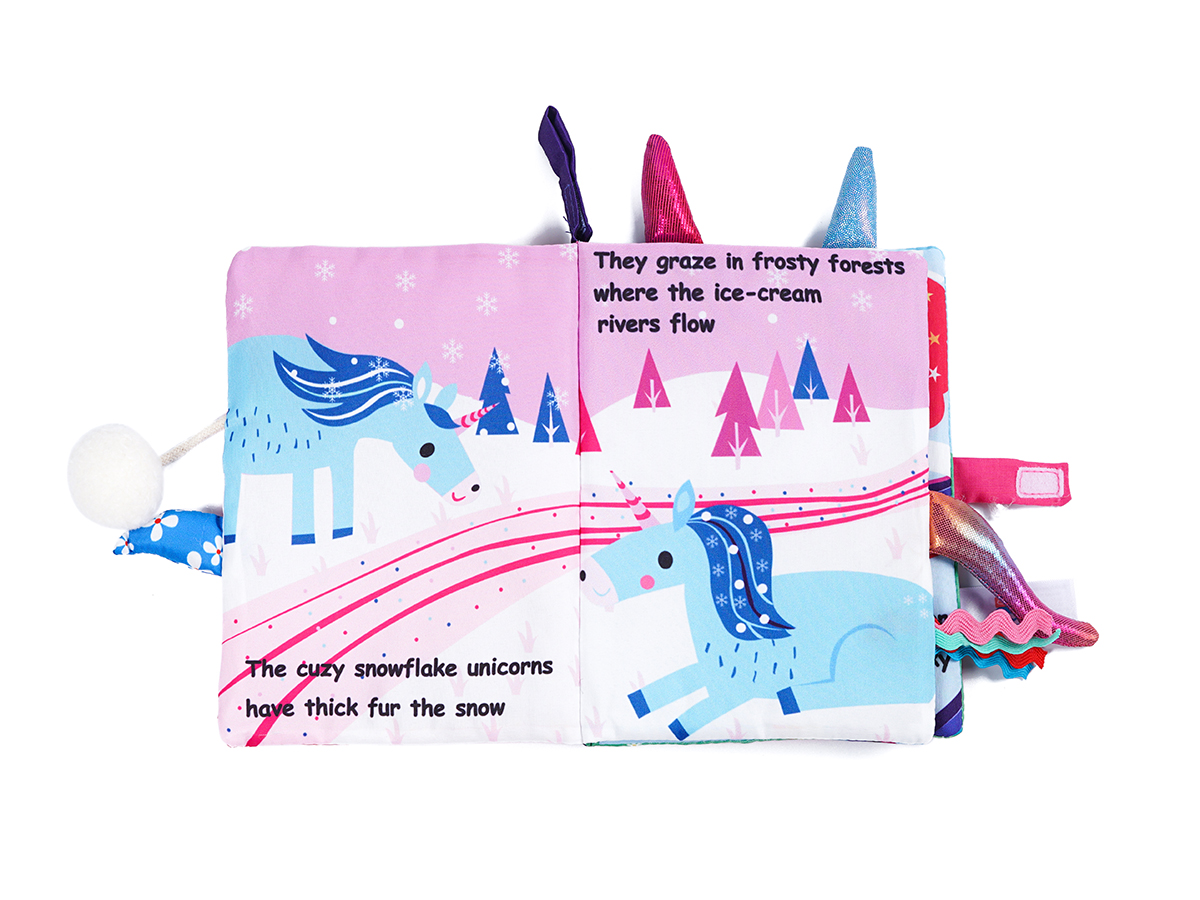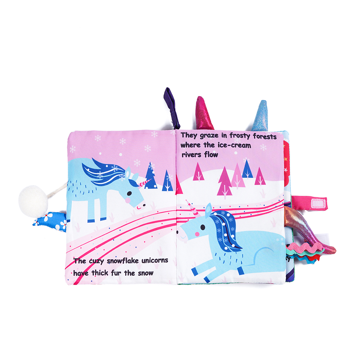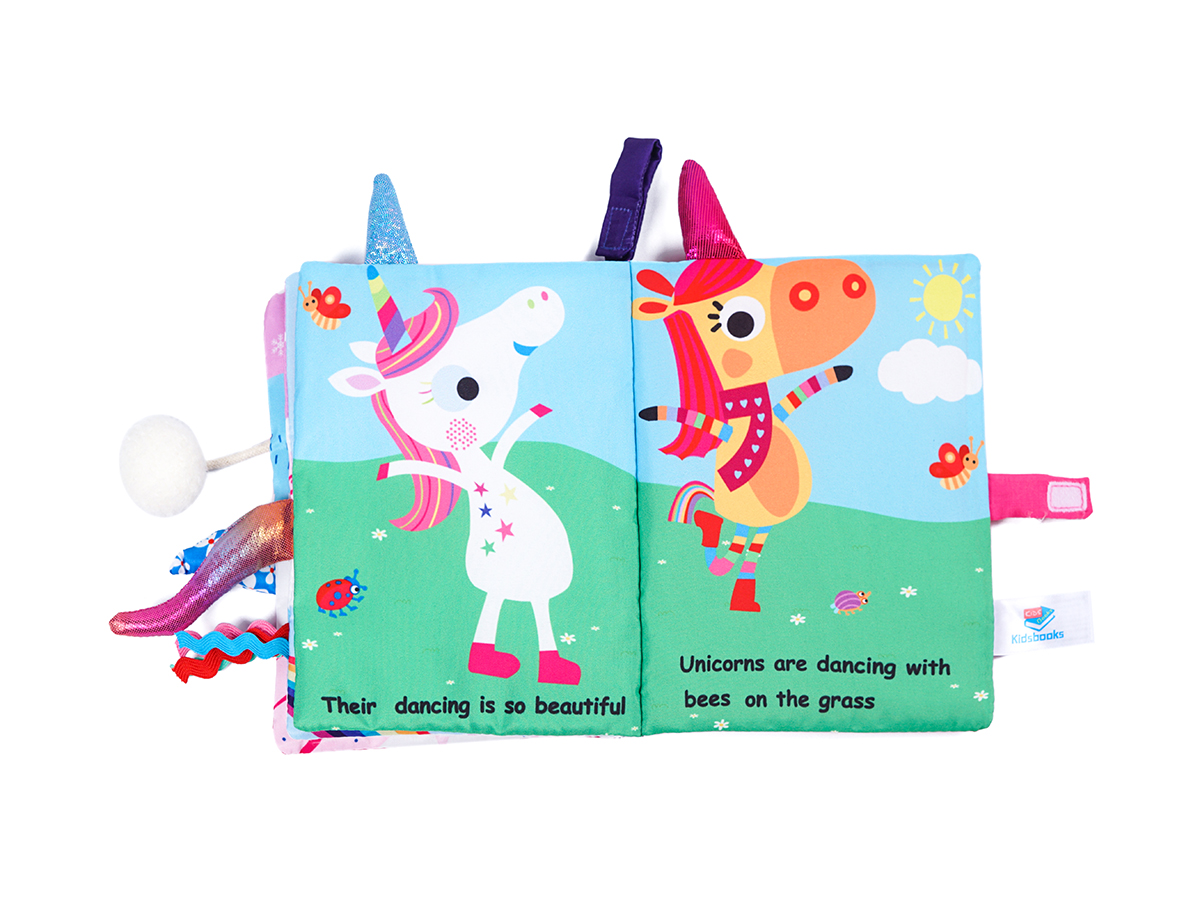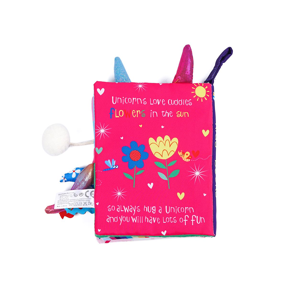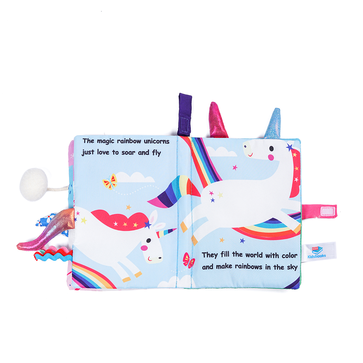 This educational cloth book is a cute way for babies to learn things that are temporarily outside their reach. This Unicorn Cloth Book is a cute short story cloth book. Reading such cute and interesting cloth books together with your baby can not only providing fun when spending beautiful parent-child time with your baby but also enhance the baby's reading interest and hands-on ability. Your baby can learn things about their surrounding as they can touch and feel different materials and see several colorful patterns, also, this cloth book is filled in safe thin plastic slices, which will allow you to hear the sound when you turn the page, making it more appealing to babies than the normal paper book.