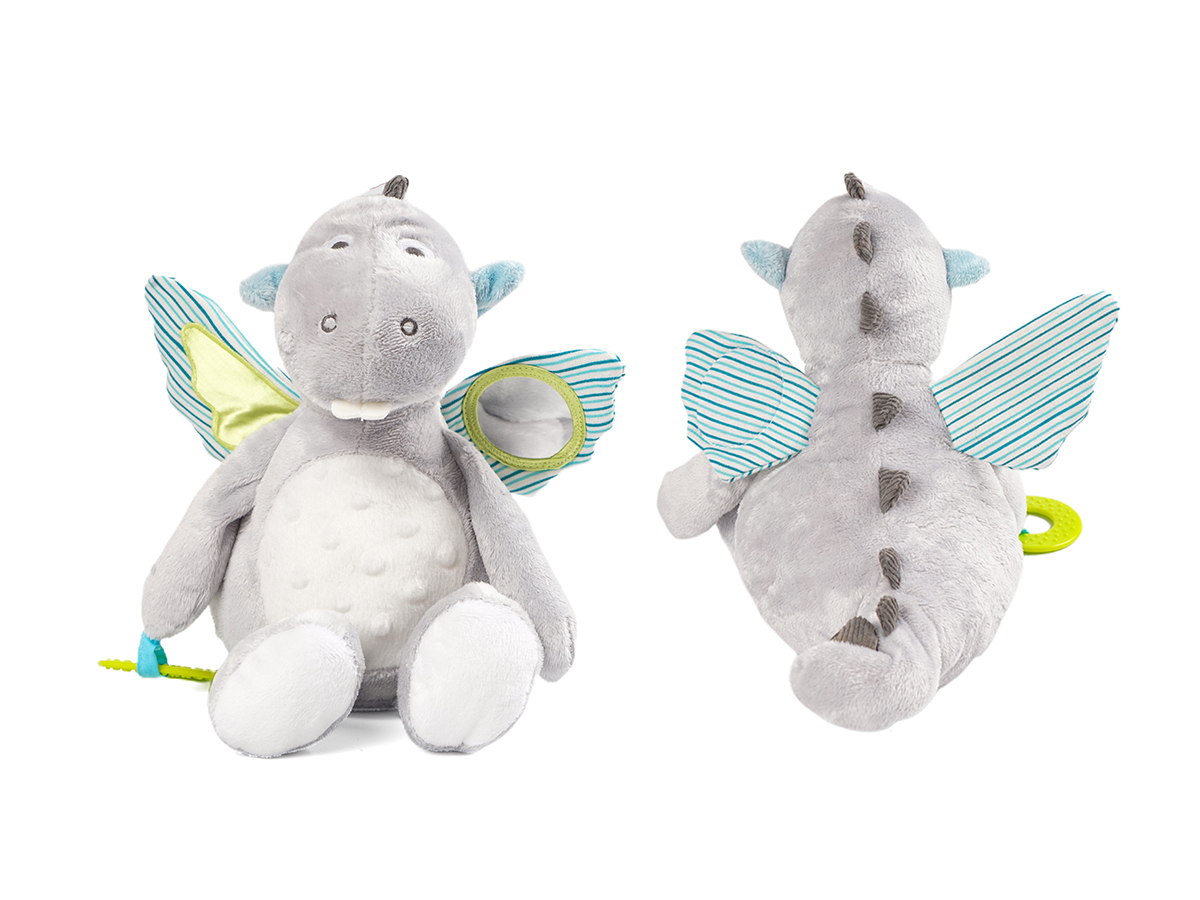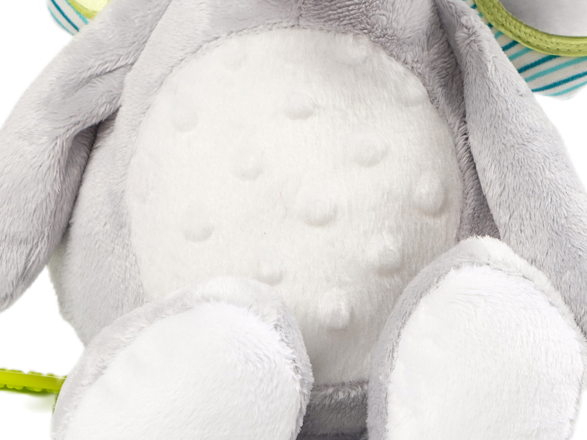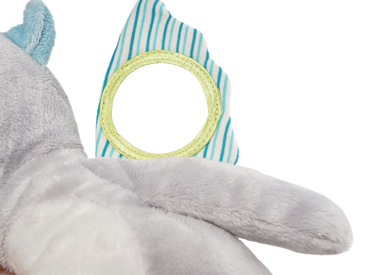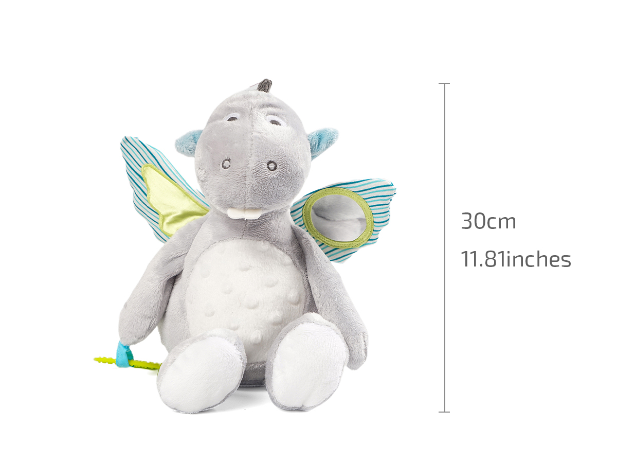 It has a small mirror on its right ear and that is how babies can observe themselves when they are playing with this soothing toy, also there embed a slice of plastic and when baby press their hands on the left ear they can hear the slight sound from it. The most interesting part is that when you pull the rope and this plush toy would start vibrating and create some noise. This soothing toy can play the role to conform baby's emotion when they get bored or uneasy.