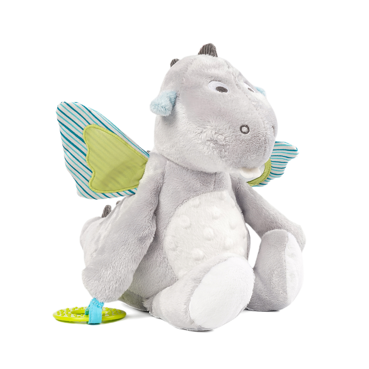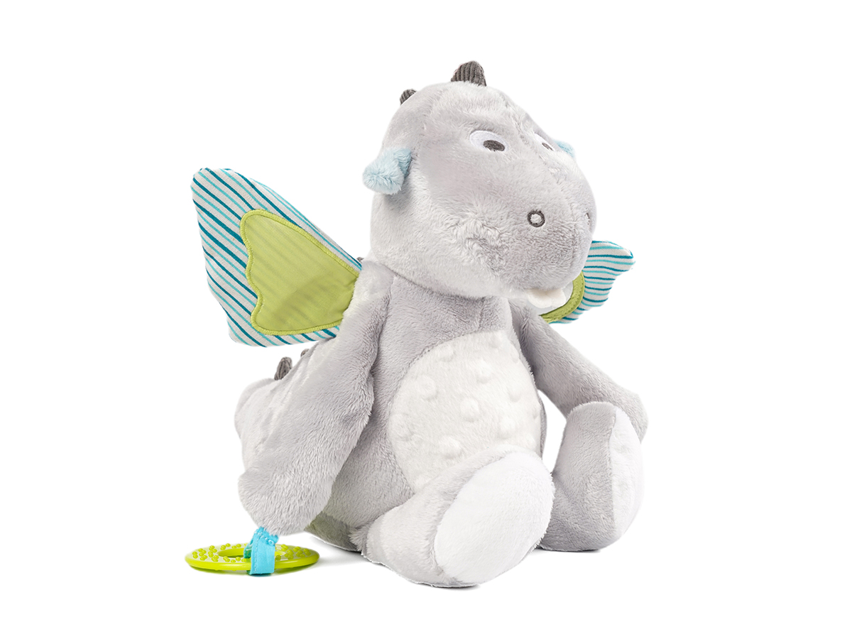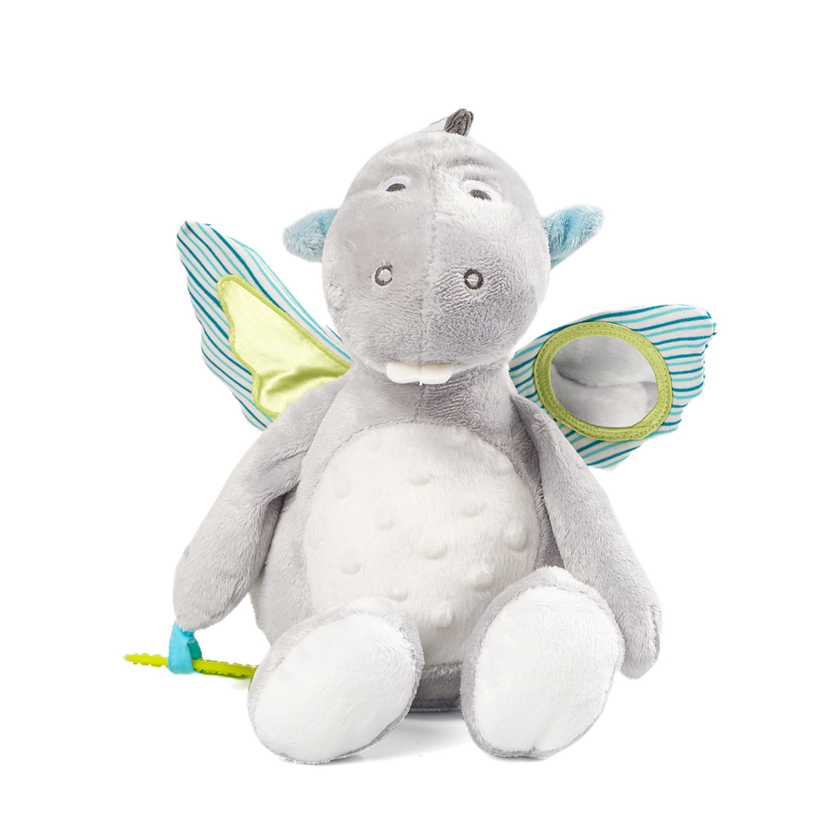It has a small mirror on its right ear and that is how babies can observe themselves when they are playing with this soothing toy, also there embed a slice of plastic and when baby press their hands on the left ear they can hear the slight sound from it. The most interesting part is that when you pull the rope and this plush toy would start vibrating and create some noise. This soothing toy can play the role to conform baby's emotion when they get bored or uneasy.