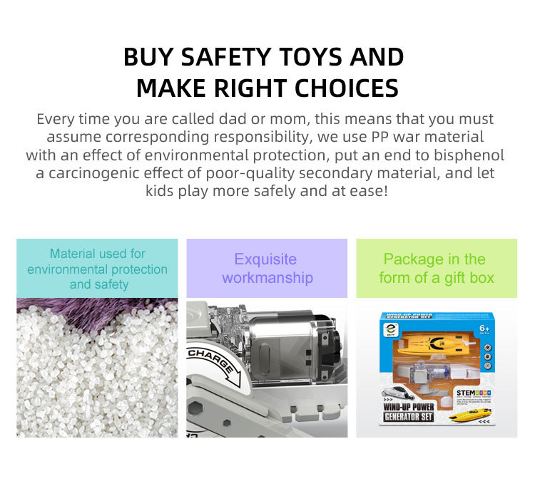 This is a kind of toy that can inspire children to learn by hand rather than boring theory. Different from traditional electric toy cars, the special feature of this product is that it generates electricity by hand, allowing children to explore scientific principles and cultivate scientific interest independently. In addition, it is also suitable for children to play with their parents and friends to enhance their relationship.