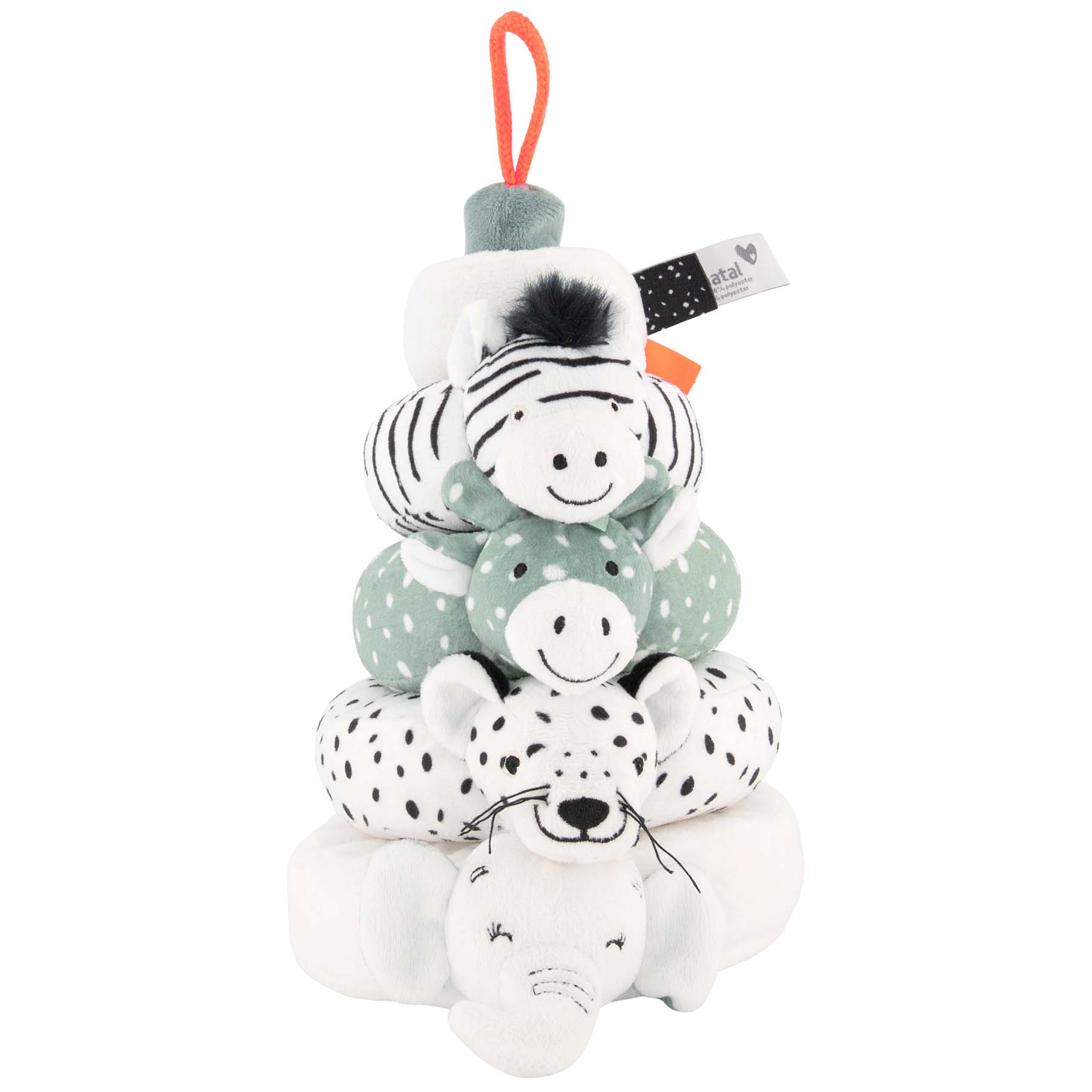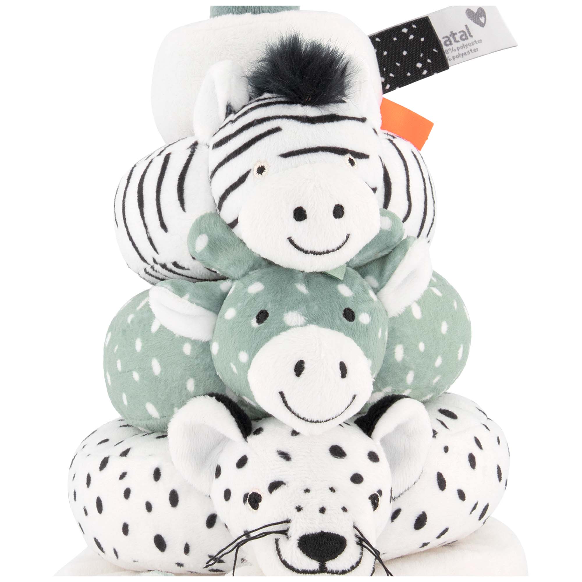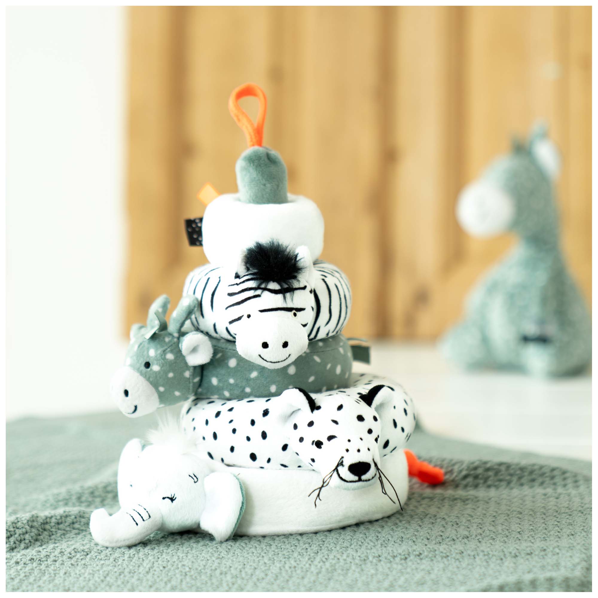 Nice to build, stack and cuddle with this soft stacking tower from Prénatal. The stacking tower comes from the Safari theme and that's why you see the zebra, elephant, giraffe and tiger. The stacking tower is completely made of plush, which makes it nice and soft.