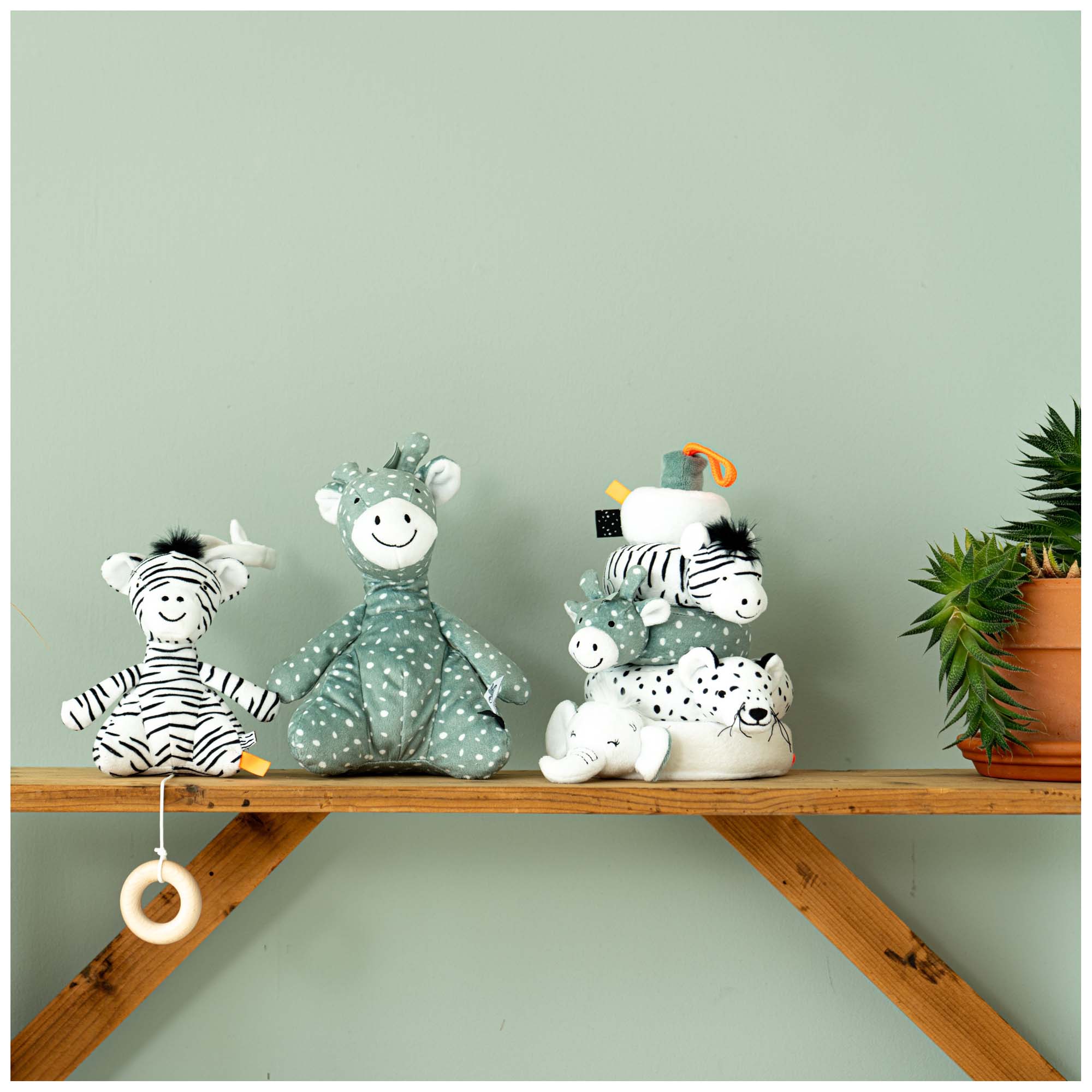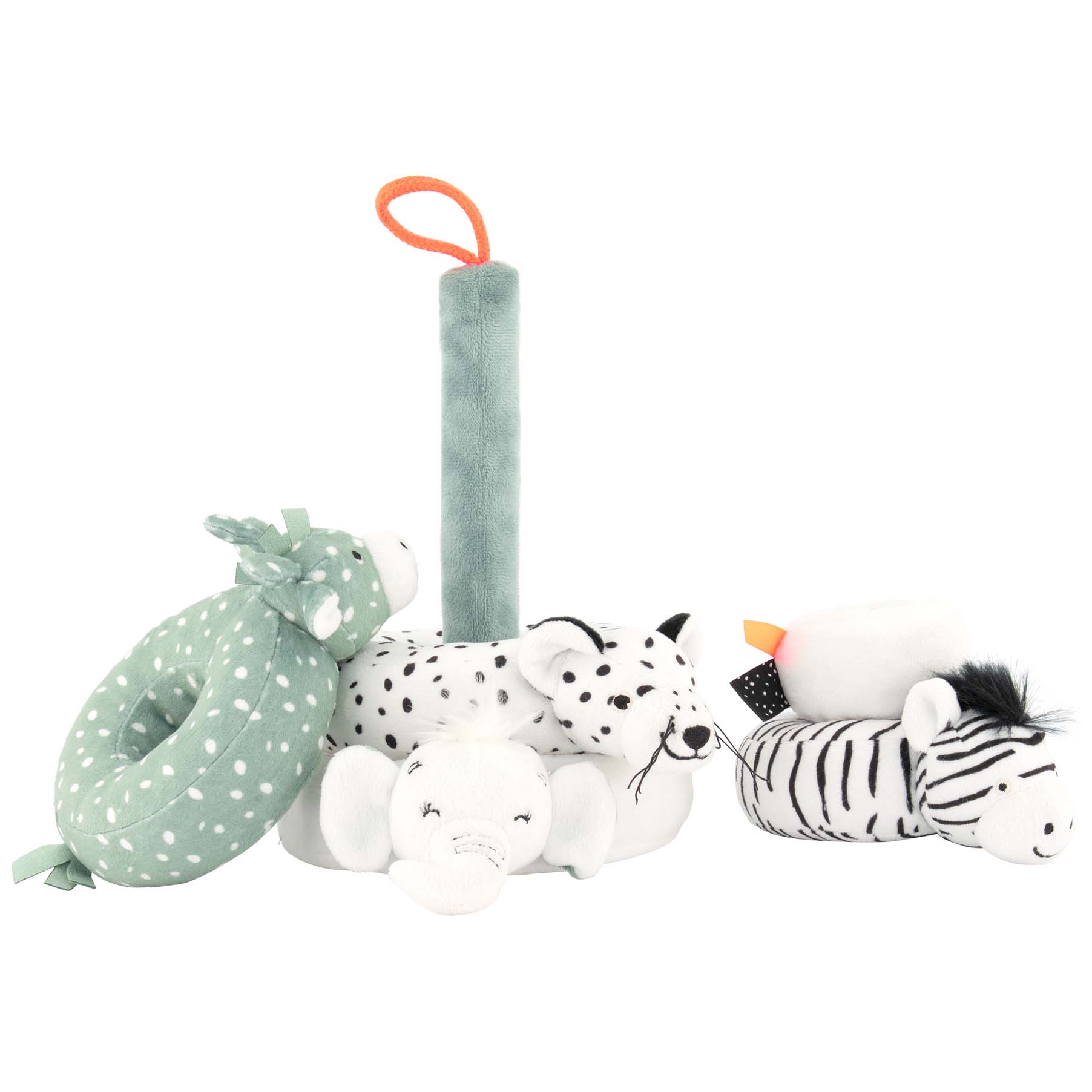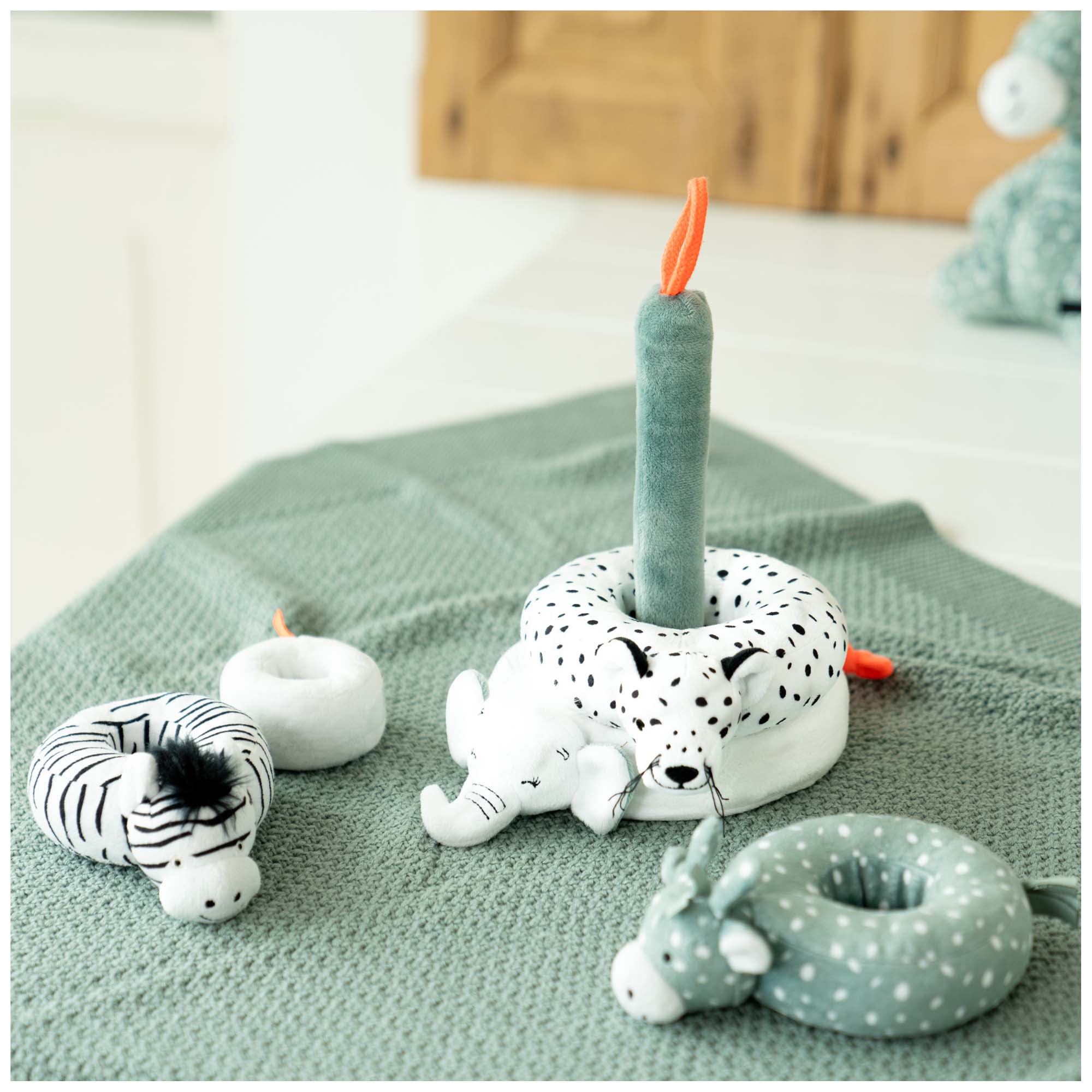 Nice to build, stack and cuddle with this soft stacking tower from Prénatal. The stacking tower comes from the Safari theme and that's why you see the zebra, elephant, giraffe and tiger. The stacking tower is completely made of plush, which makes it nice and soft.