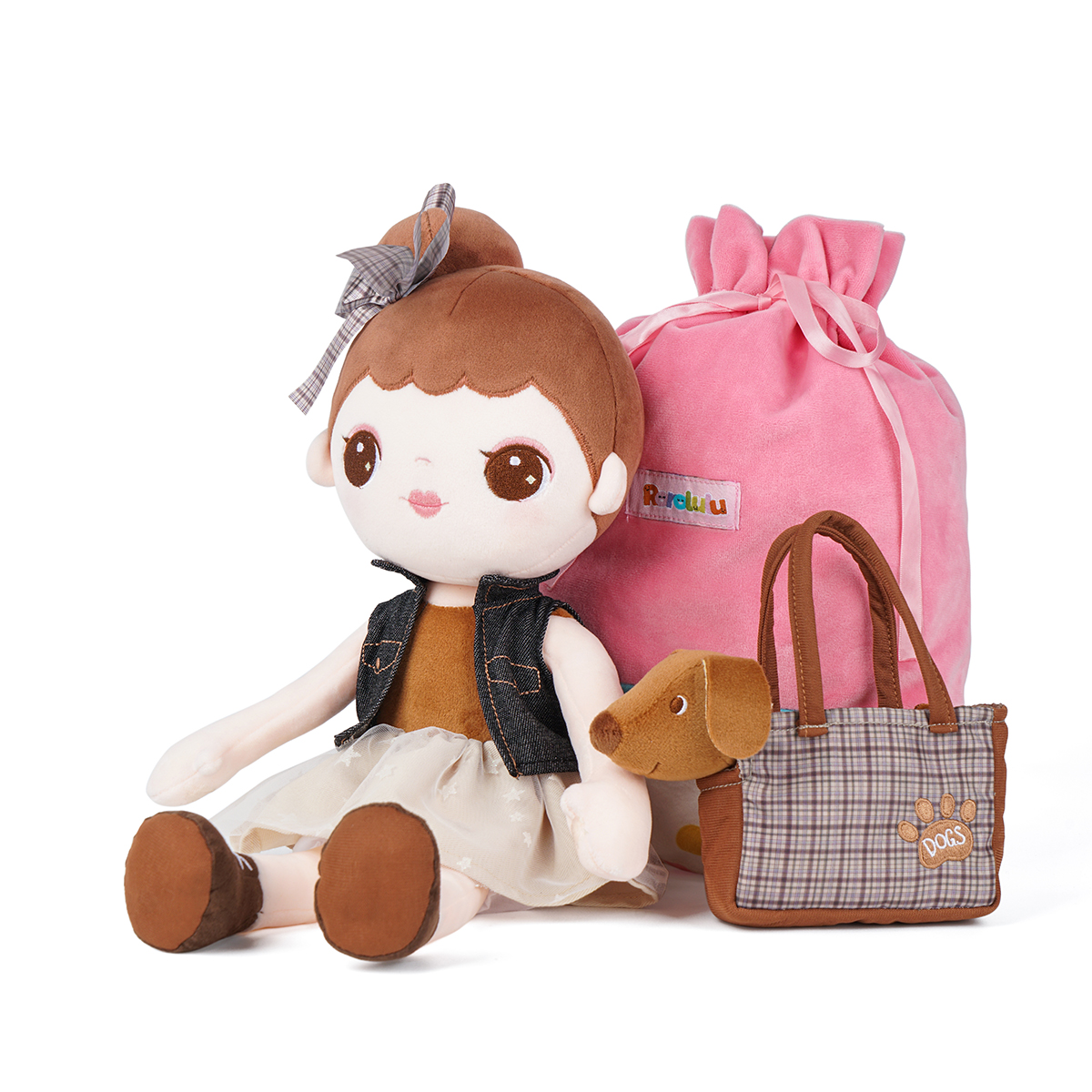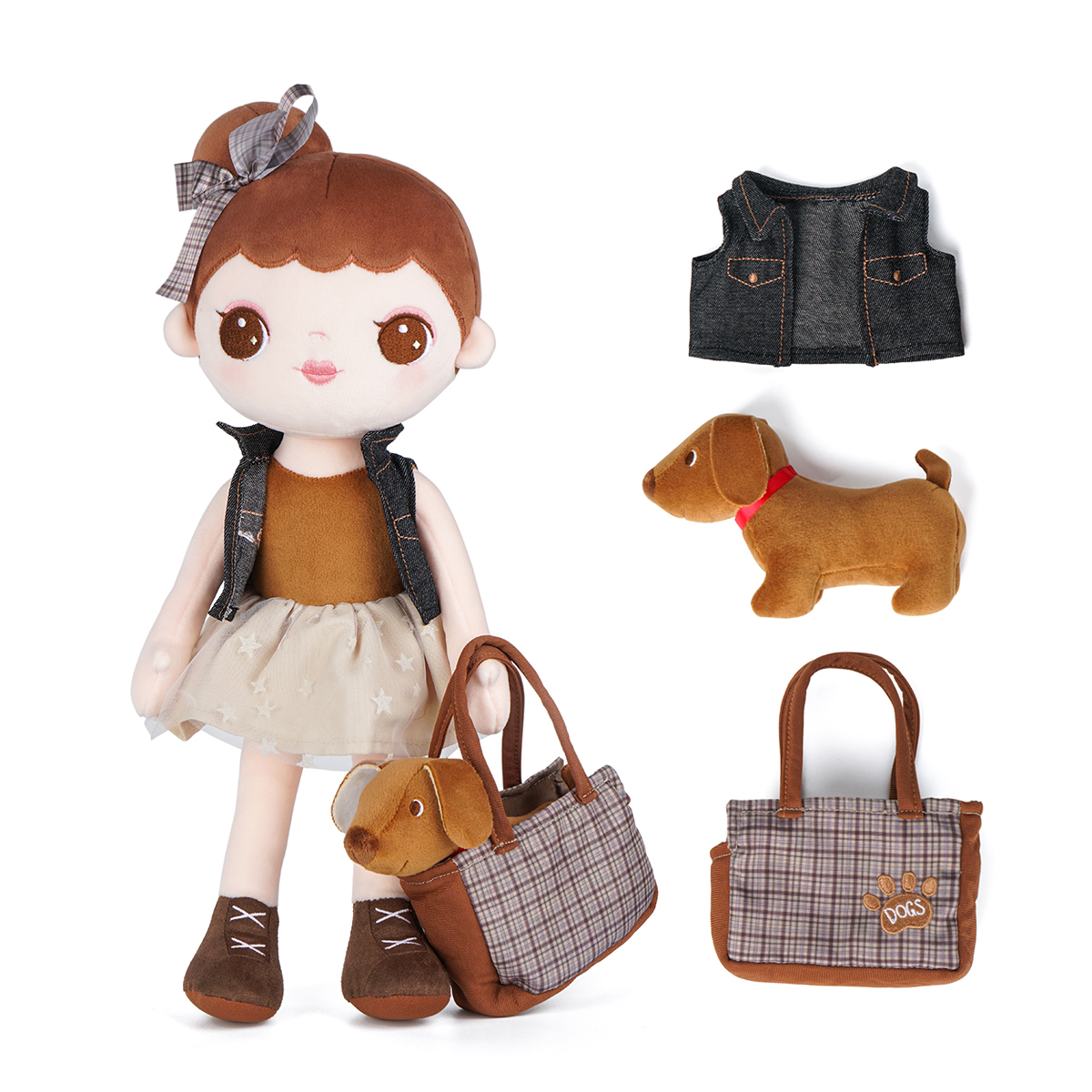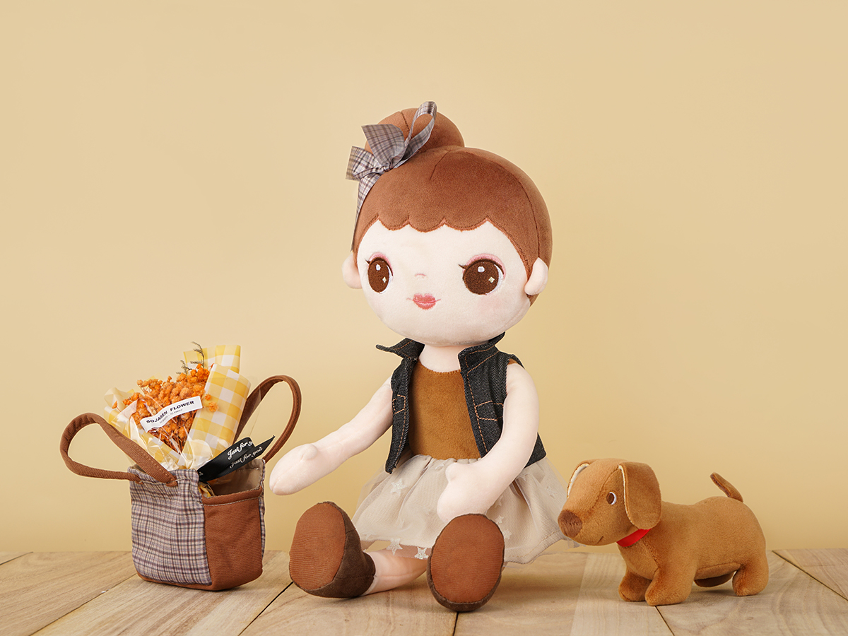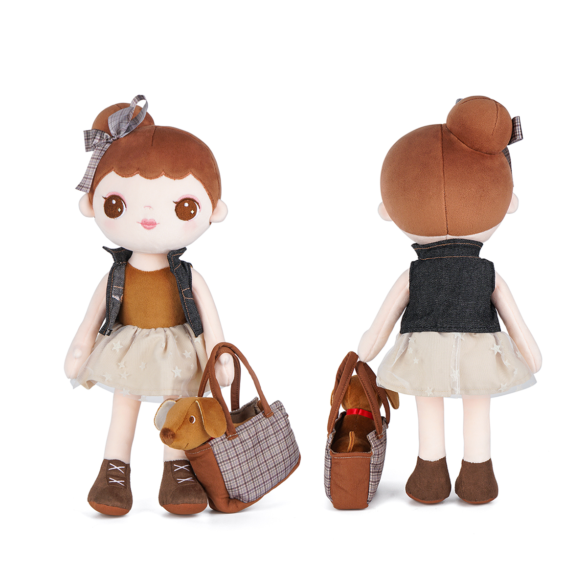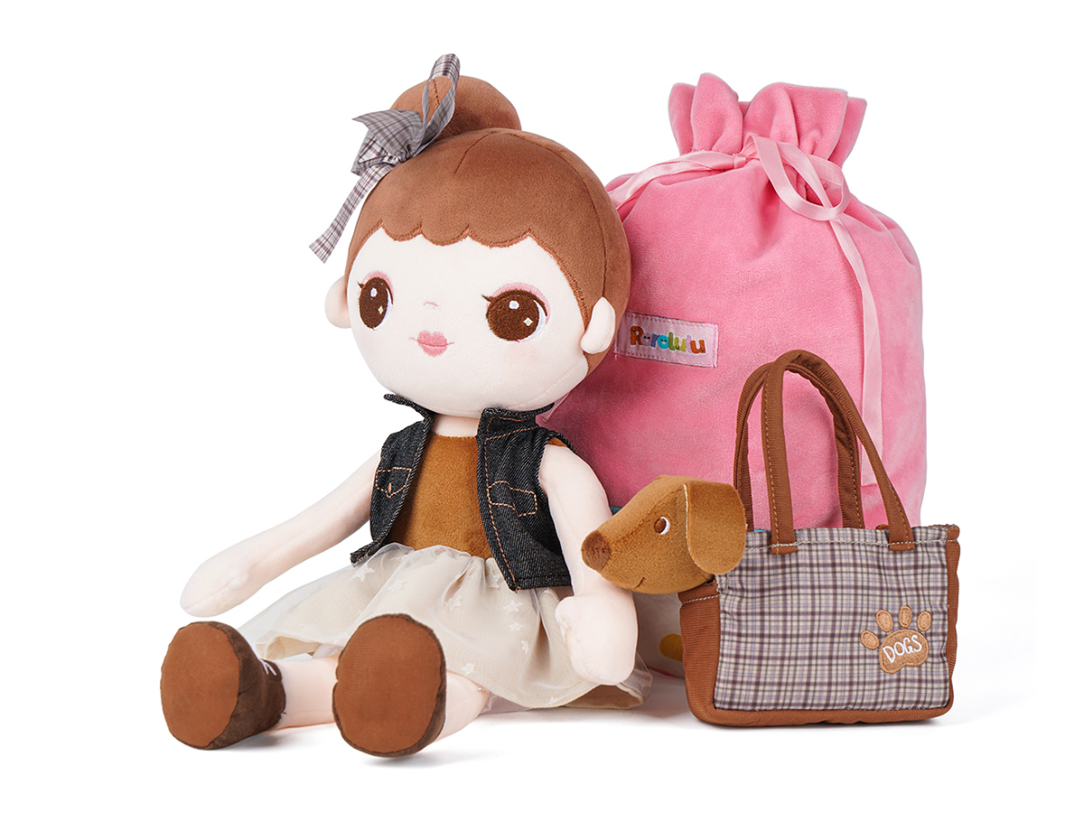 Every kid needs a constant companion throughout early childhood. The little girl features a casual denim jacket and pettiskirt with star pattern. The jacket can be removable and interchangeable. The little brown dog has an exquisite lattice tote bag, so the little girl can take it outside easily. Buddies not only provide kids with a sense of comfort and security but also help develop their social skills and emotional abilities. Through the actions of touching and hugging, little boys and girls gain precious experience of role-plays throughout early childhood and develop early-stage caregiving skills. Kids are sure to love this doll for years!