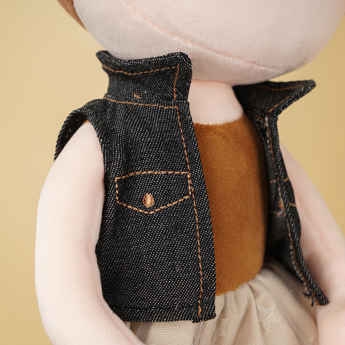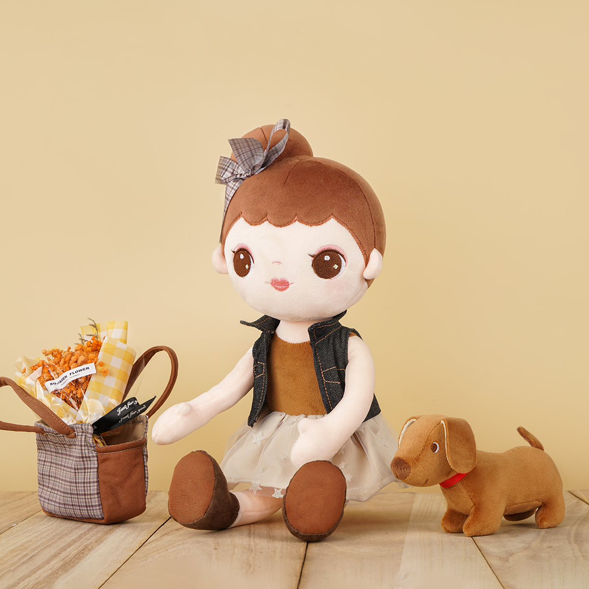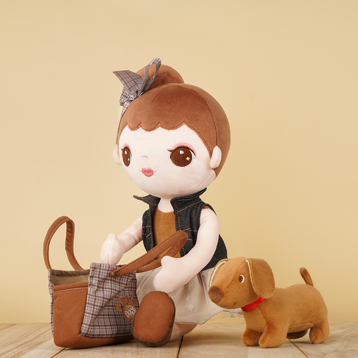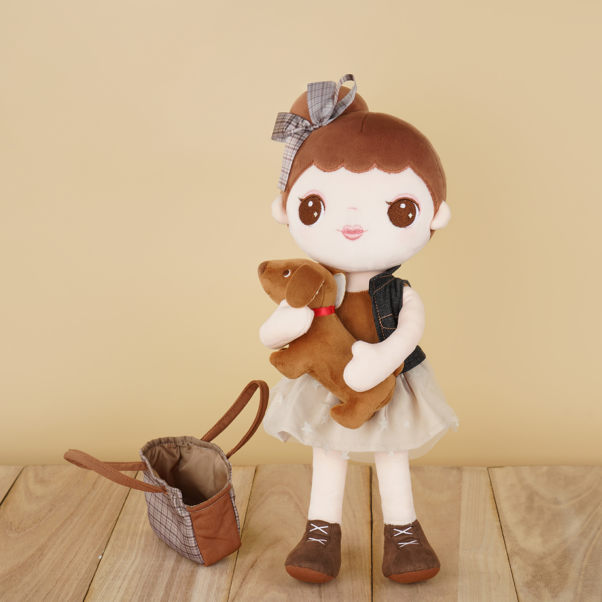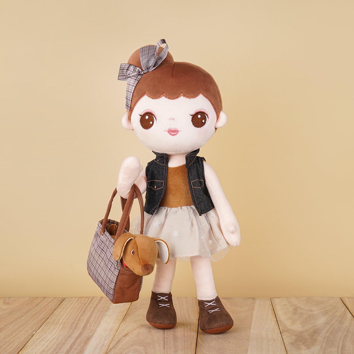 Every kid needs a constant companion throughout early childhood. The little girl features a casual denim jacket and pettiskirt with star pattern. The jacket can be removable and interchangeable. The little brown dog has an exquisite lattice tote bag, so the little girl can take it outside easily. Buddies not only provide kids with a sense of comfort and security but also help develop their social skills and emotional abilities. Through the actions of touching and hugging, little boys and girls gain precious experience of role-plays throughout early childhood and develop early-stage caregiving skills. Kids are sure to love this doll for years!