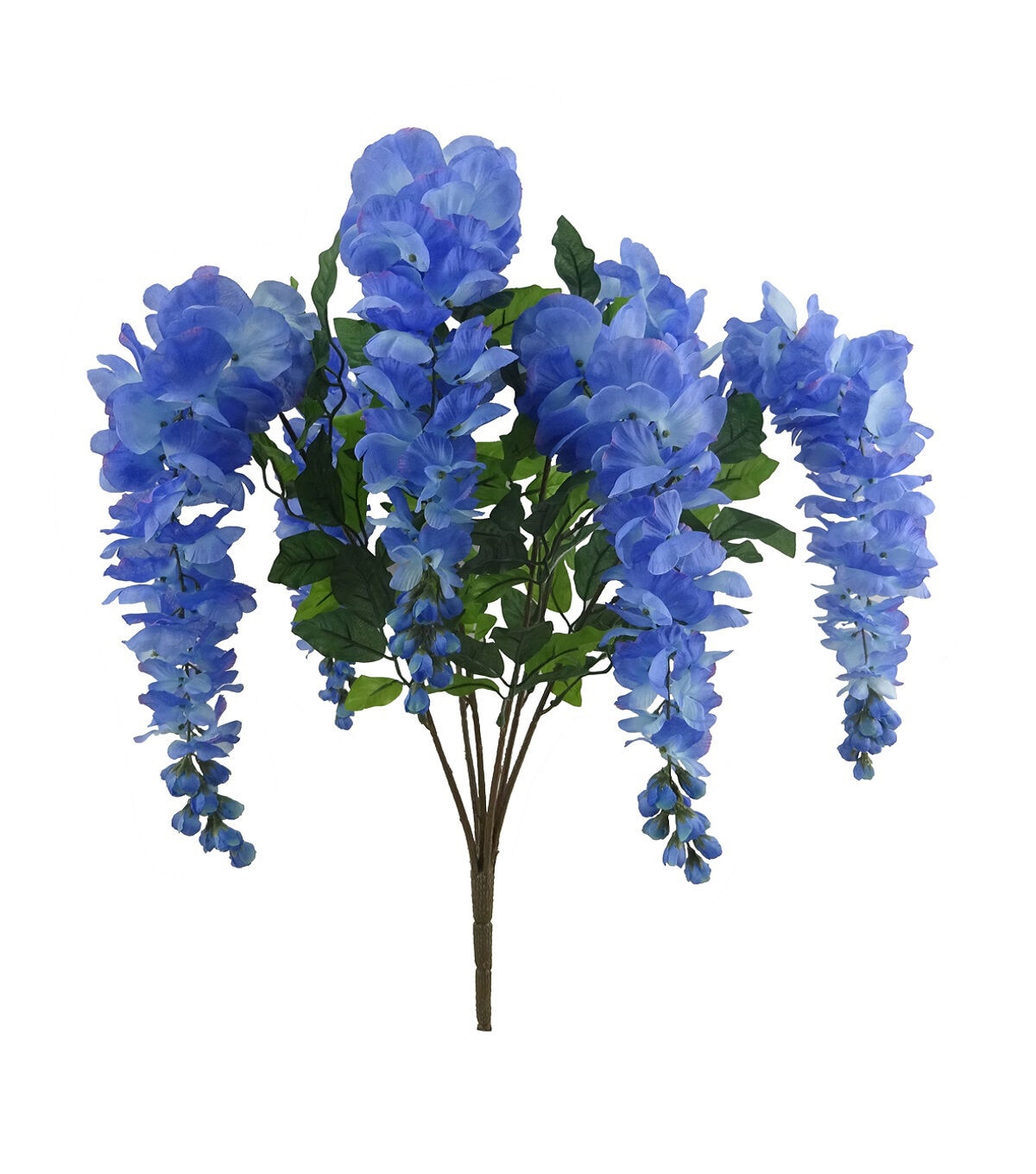 Add seasonal charm to your decor with the Bloom Room Wisteria Bush - Blue. It bears stunning wisteria vine flowers in blue and leaves. This faux floral bush will look lovely when teamed with peonies, hydrangeas, roses and more in contrasting hues, and can be used to create a stunning floral centerpiece for the living room.