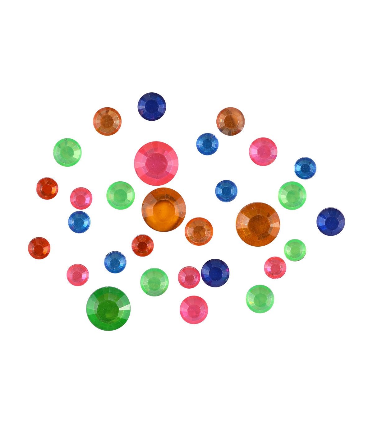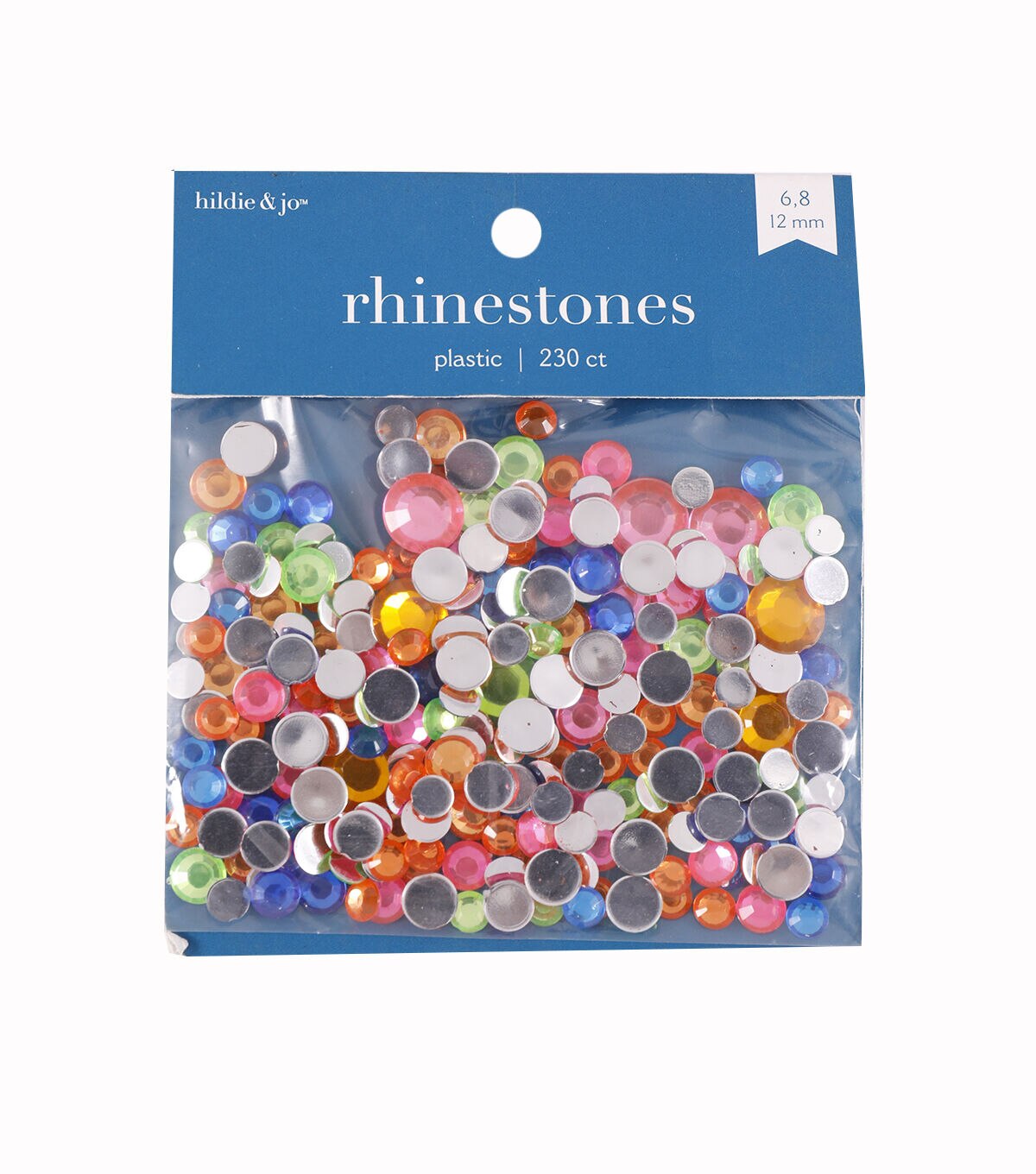 The hildie & jo Assorted Round Plastic Rhinestones - Neon will add sparkle to dozens of fun projects. These colorful acrylic rhinestones come in assorted neon colors and sizes. All you need to do is just apply a little glue on the back and paste them onto any flat craft surface. This pack includes 22 grams of rhinestones that measure 6, 8 and 11 mm.