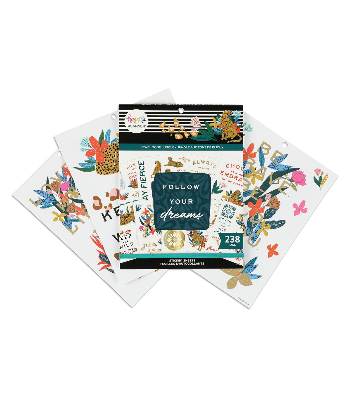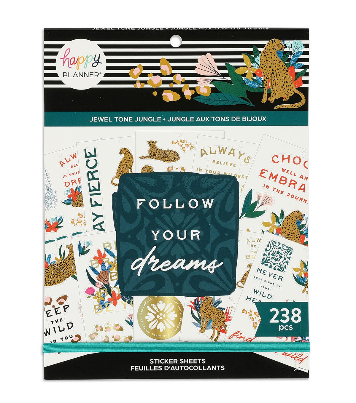 This jungle themed sticker book features large icon stickers with inspirational quotes, colorful designs, and alphabet letters. These are great for Big size planners, scrapbooks, guided photo journals, and other DIY projects. It comes with 15 sheets and 238 stickers with gold foil accents.