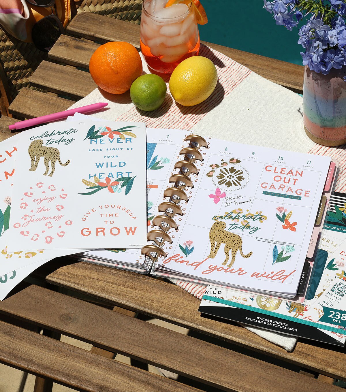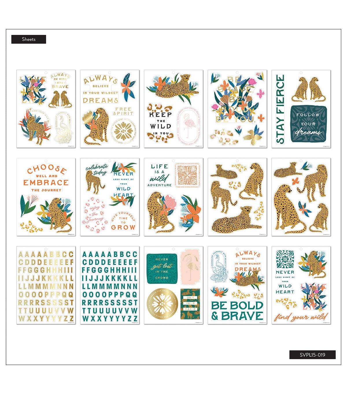 - Features inspirational quotes, cheetahs, and alphabet stickers with gold foil accents