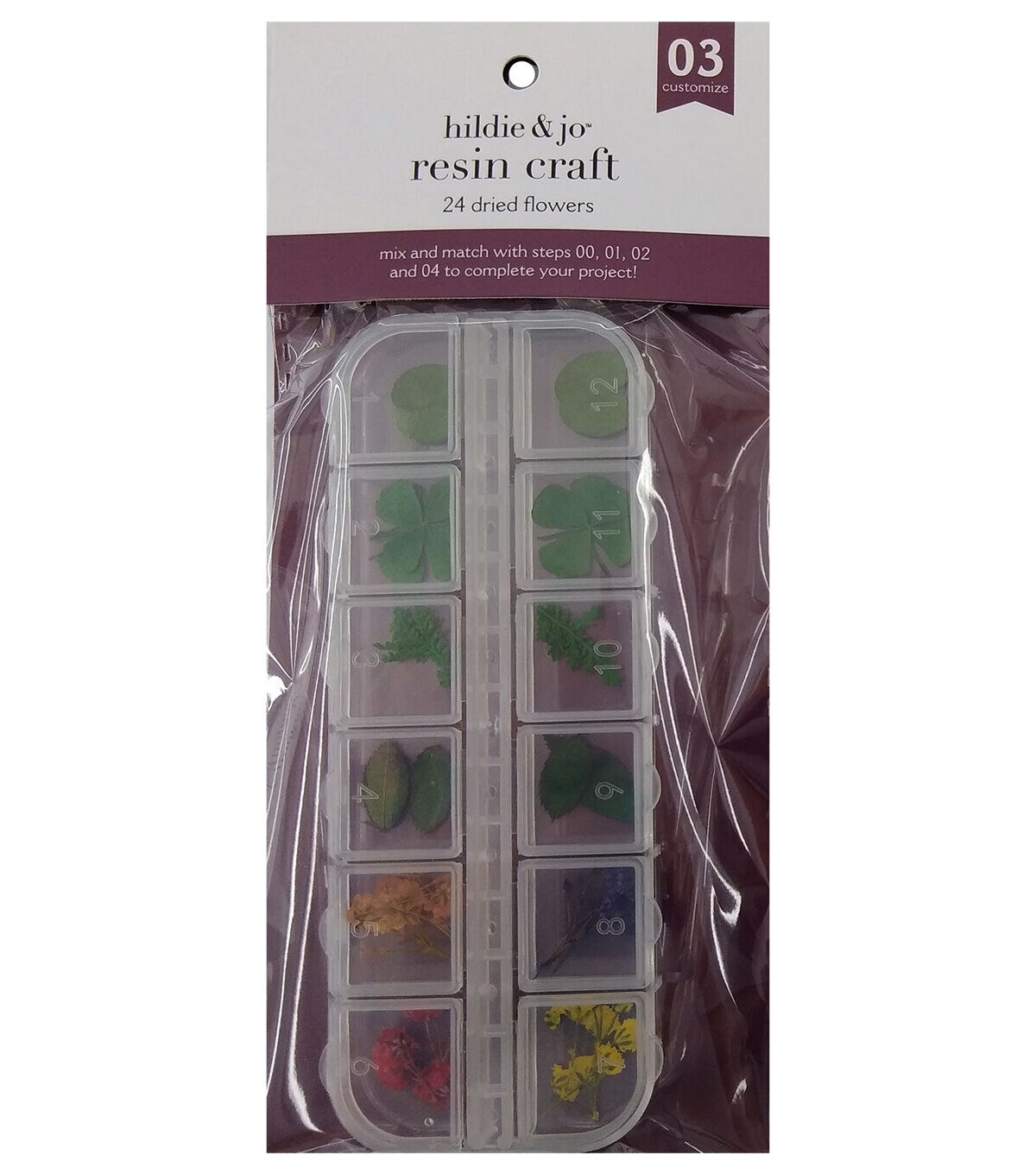 Brighten up your resin craft using these dried flowers to create a unique piece. There are twenty four in all, two if each kind. There are two small and two large green leaves and four, four leaf clovers, there are two small and two large leaf branches, two small and two large single leaves. Four different colors of wild flowers, two of each color, orange, purple, red and yellow. Use these to customize your resin craft. Resin crafts have four easy steps: select mold, pour resin, customize, cure. Create your own unique piece!