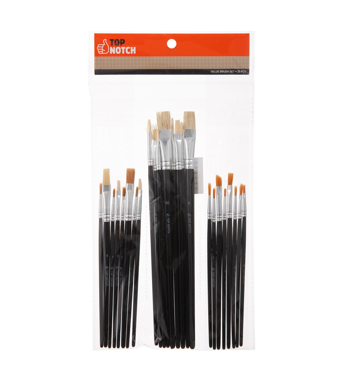Quality and Value are always top priority for Top Notch. This 25pc brush set features many shapes and sizes mostly in larger sizes. The set included both short and long handle brushes.