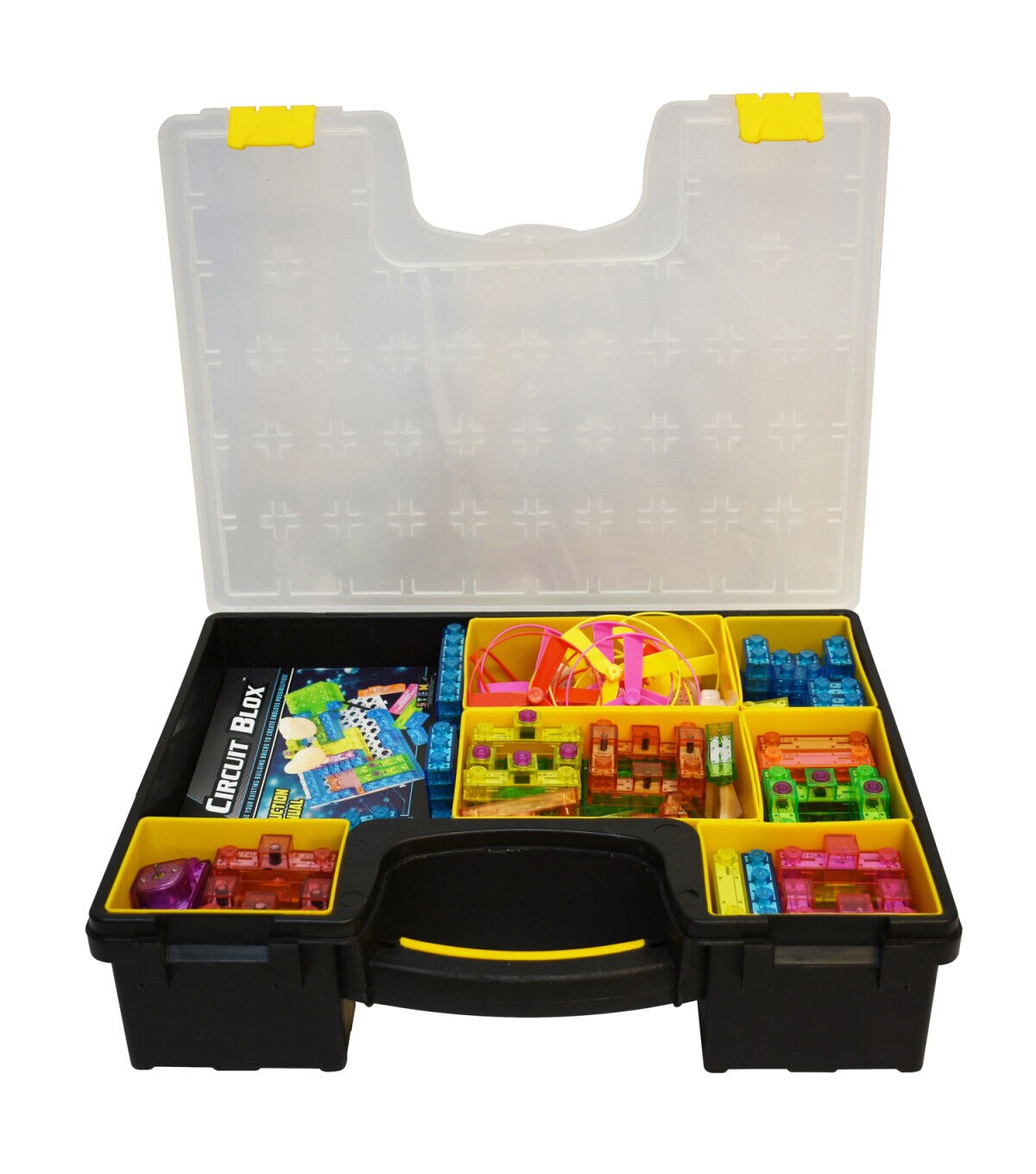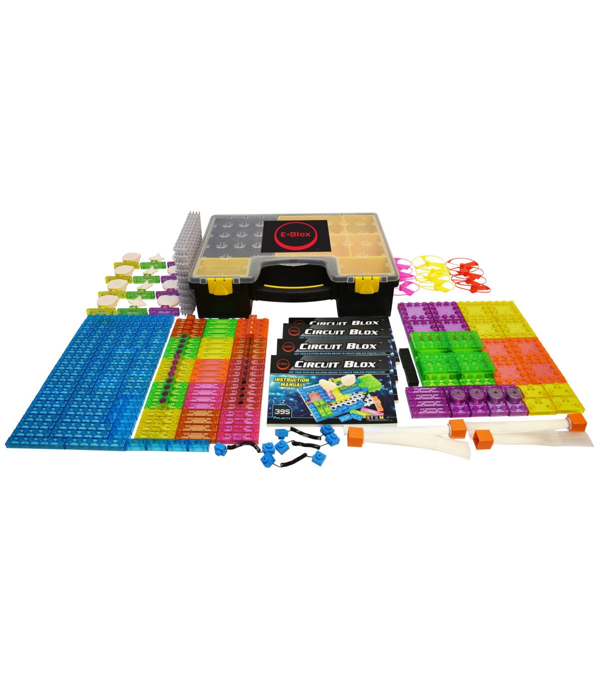 This set provides four Circuit Blox 395 kits (CB-0170), all packed into a sturdy storage case for sharing in the classroom. Each kit provides hours of fun and educational play. The colorful building blocks contain electronic components such as a battery module, switches, LEDs, resistors, photo-resistor, capacitors, transistor, motor, speaker, IC sound module, amplifier or FM receiver. Each kit builds 395 different 3D circuits that teach STEM and light a star, spin a motor to launch a fan high in the air, play music, sirens and space battle sounds, and even build your own FM radio and alarm clock!
