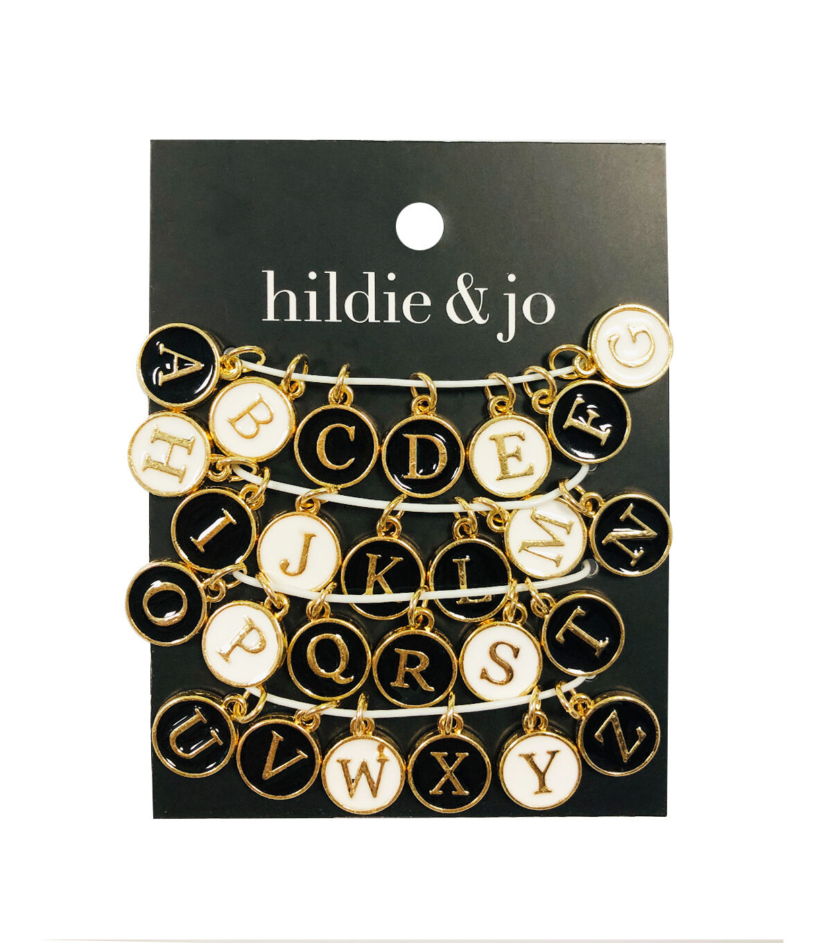 The hildie & jo Enamel Letter Charms - Black & White are perfect for making a bracelet or neckpiece. This pack consists of 26 circular charms each flaunting a gold-toned letter. They are accented with a gold-toned rim for visual appeal. Team these charms with colorful glass beads to create a name bracelet. Jewelry pieces made with these charms will also make a great personalized gift for a dear one.