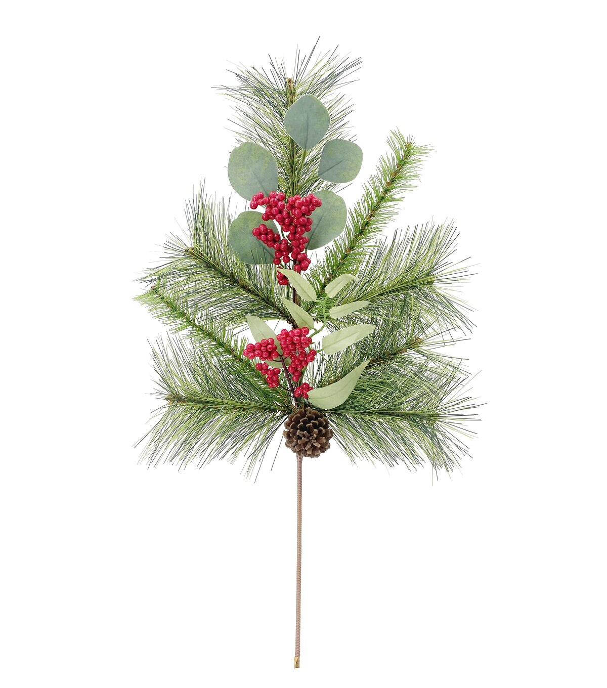 Create a delightful floral arrangement for the mantelshelf or entryway table by teaming the Christmas Berry & Pine Stem by Bloom Room with faux floral bushes. This faux stem is designed with a pinecone, pine needles, eucalyptus leaves and red berries. It will also make a great standalone accent for a windowsill.
