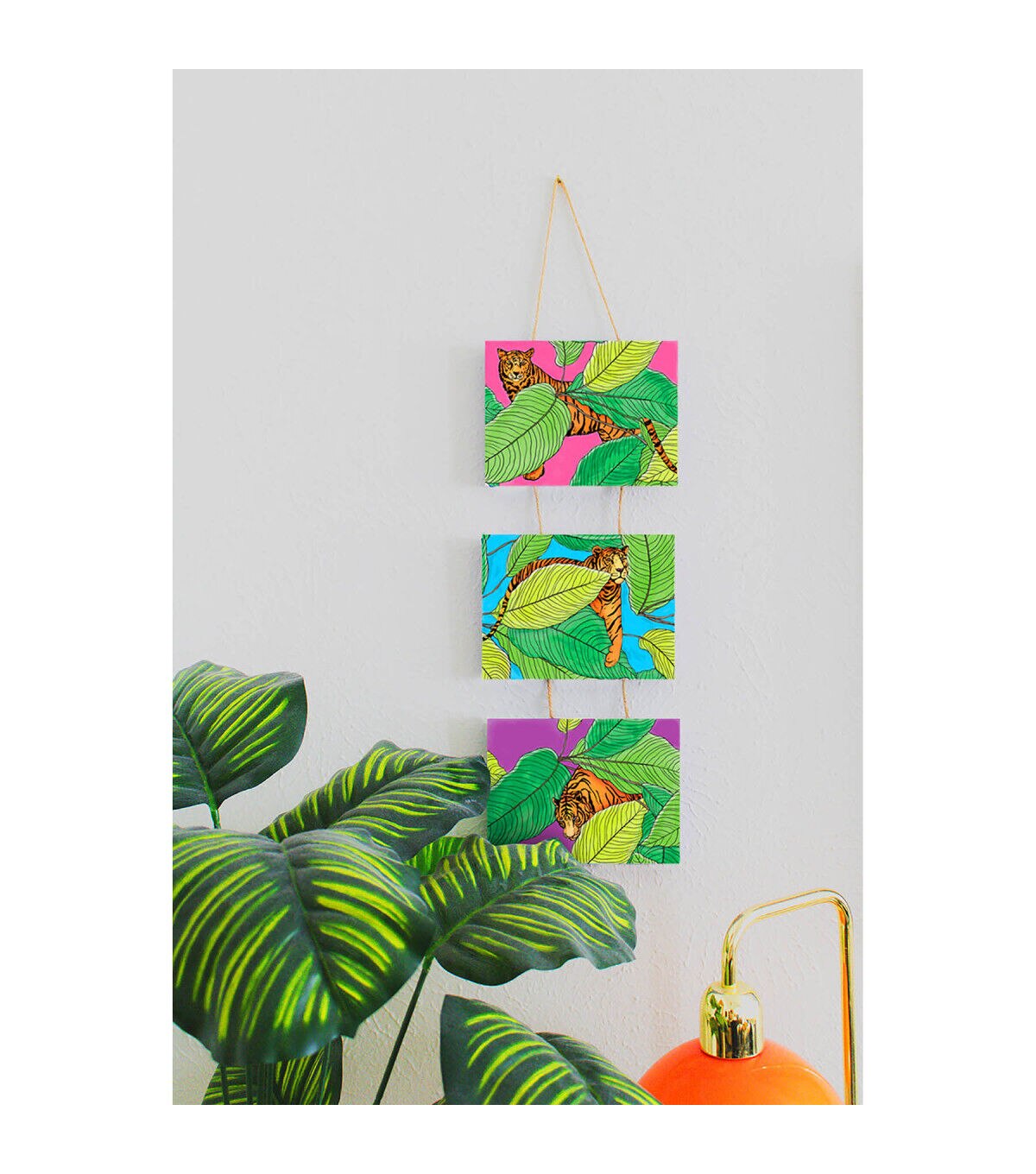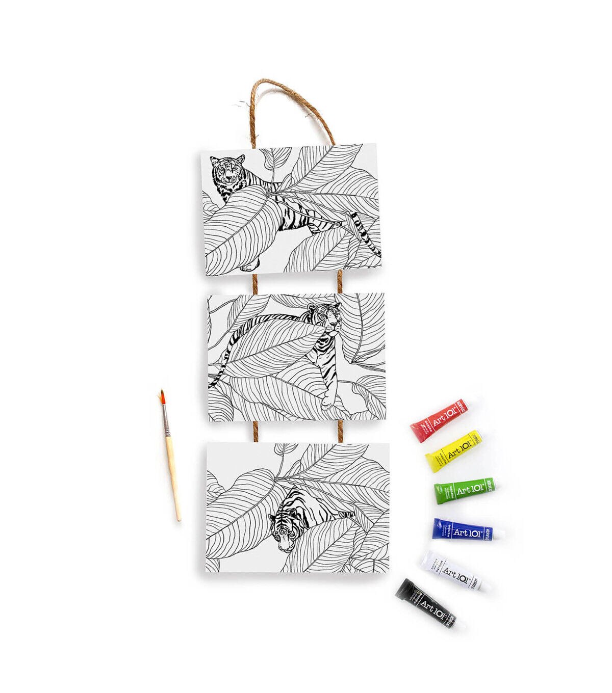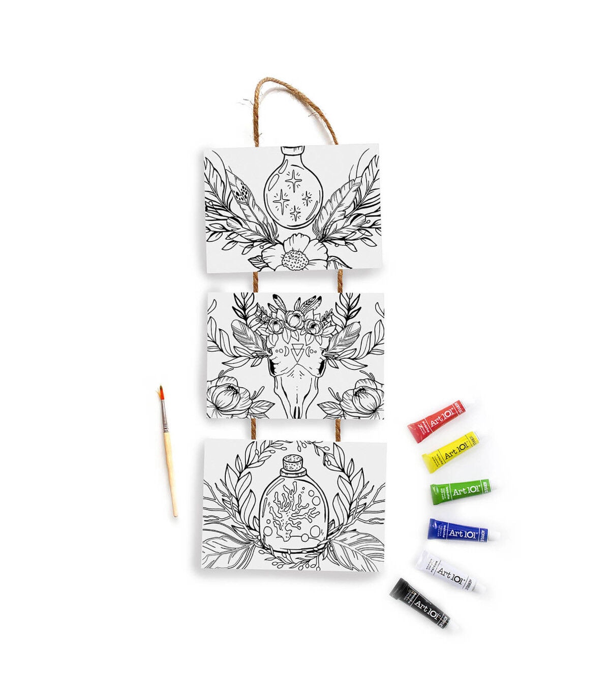 Art 101's Hanging Canvas Wall Art Set Two Pack comes with two designs, each with three 5 inch by 7 inch stretched cotton canvases on rope. Each hanging canvas is printed with trendy designs, carefully curated by our design team to spruce up your home, office, dorm room, or any personal space! Each canvas design comes with 6 acrylic paints and 1 paint brush (total of 12 paints and 2 paint brushes together) to paint and personalize your art! Mix and blend your paint colors together to create a variety of colors to add to your design. Acrylic paint offers the benefit of drying quickly, allowing you to paint efficiently with little down-time. These canvas projects are the perfect activity for a low key night at home or to gift to someone who loves creative do-it-yourself projects! Our paints are non-toxic and durable once dry. Once you finish painting your designs, your art project doubles as a new home decor piece! Simply hang somewhere of your choosing to display your finished work.
