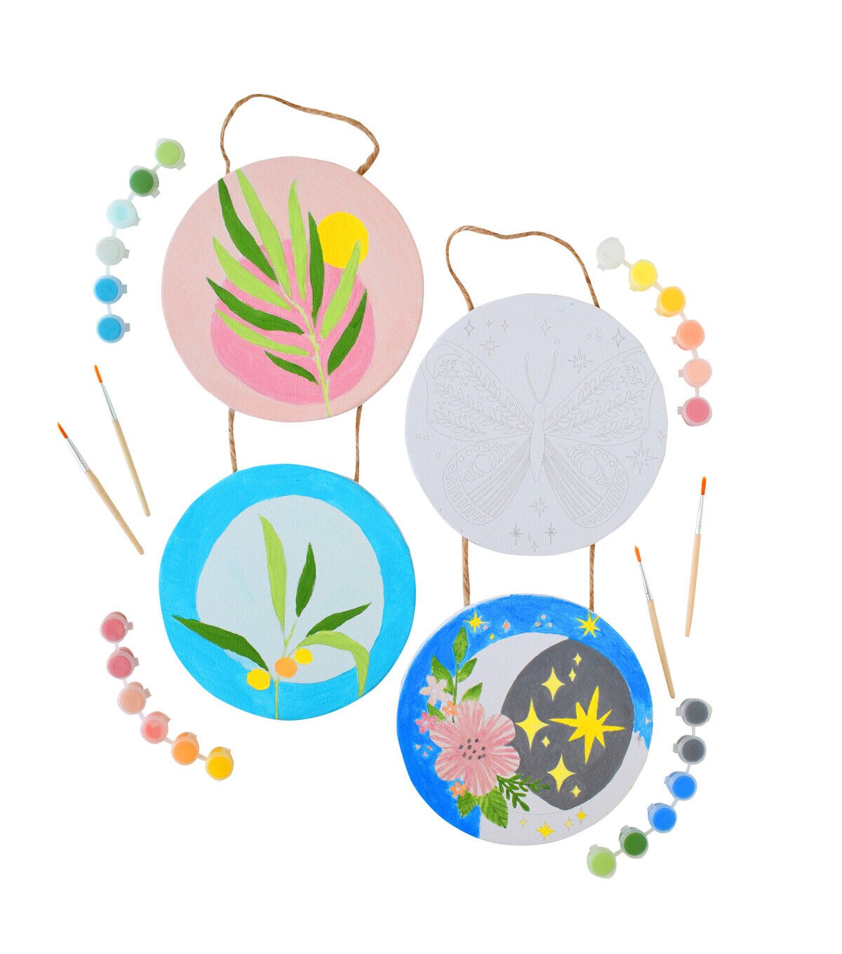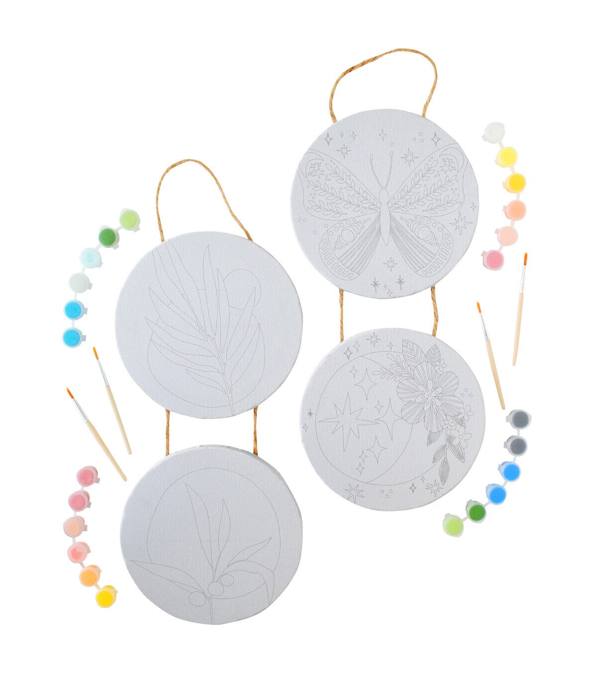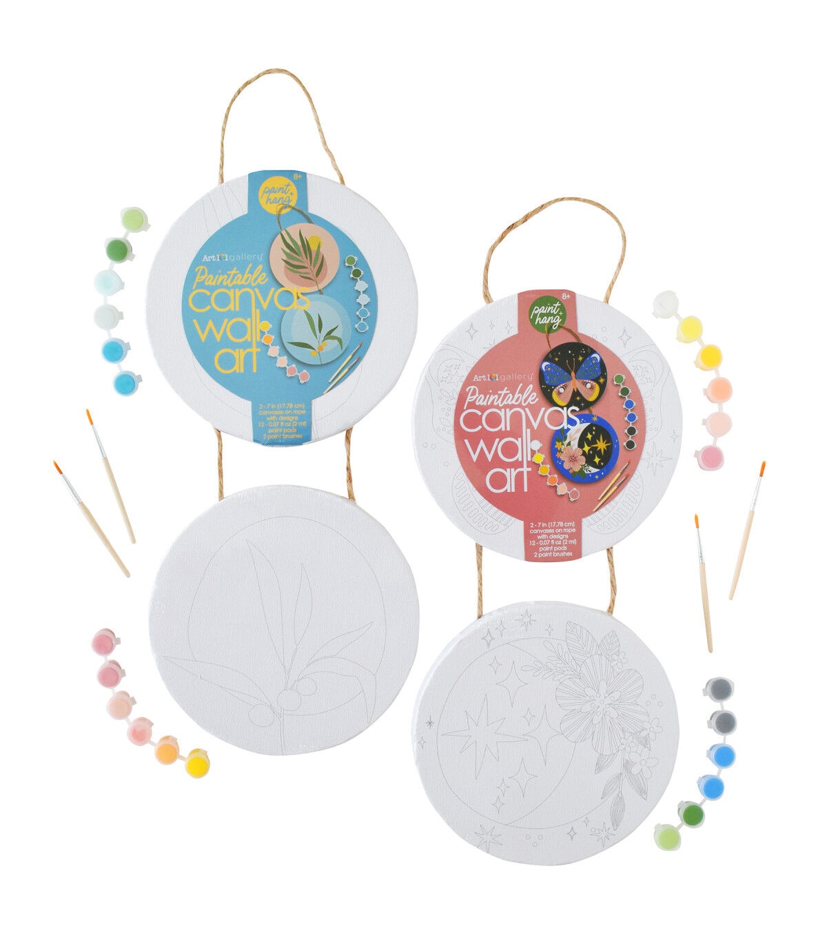 Art 101 Gallery Paint and Hang Paintable Canvas Wall Art includes everything you need for the perfect piece of hanging art! This Two Pack comes with two designs, each with 2 circle canvases on rope with beautiful trendy designs for you to paint. This hanging canvas is the perfect addition to any room. Each canvas set includes 2 paint brushes and 12 bright and vibrant paint pods, for a total of 24 paint pods and 4 paint brushes. The possibilities are endless as you mix and match shades to create the perfect personalized design. A great creative activity for the experienced or beginner artist alike, you can choose to use our design inspiration or create your own!