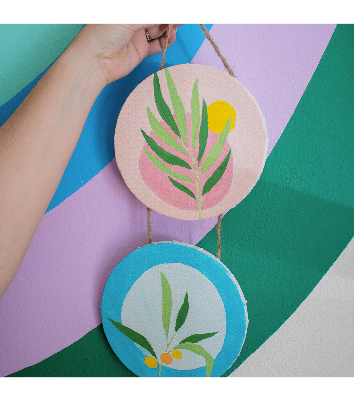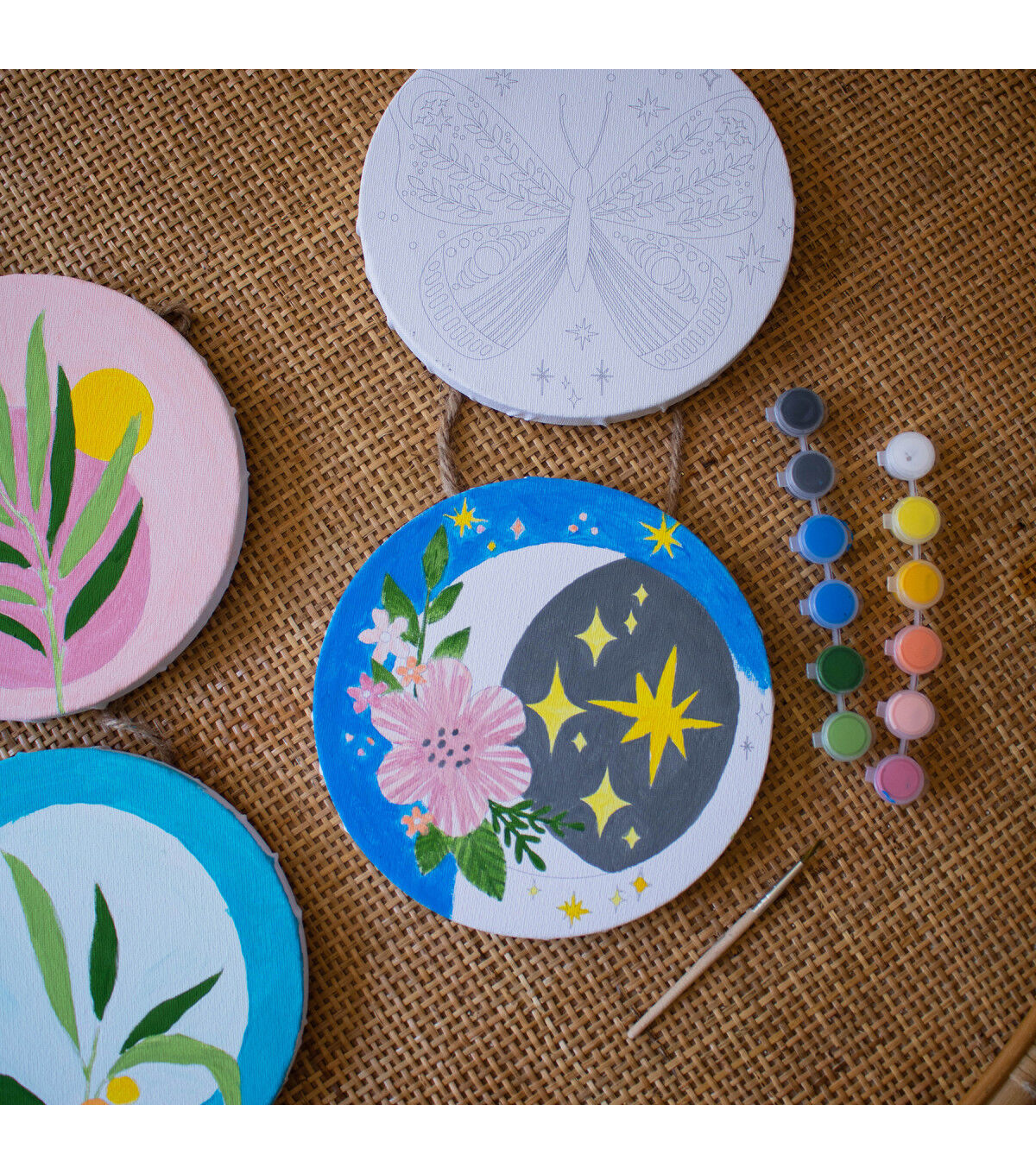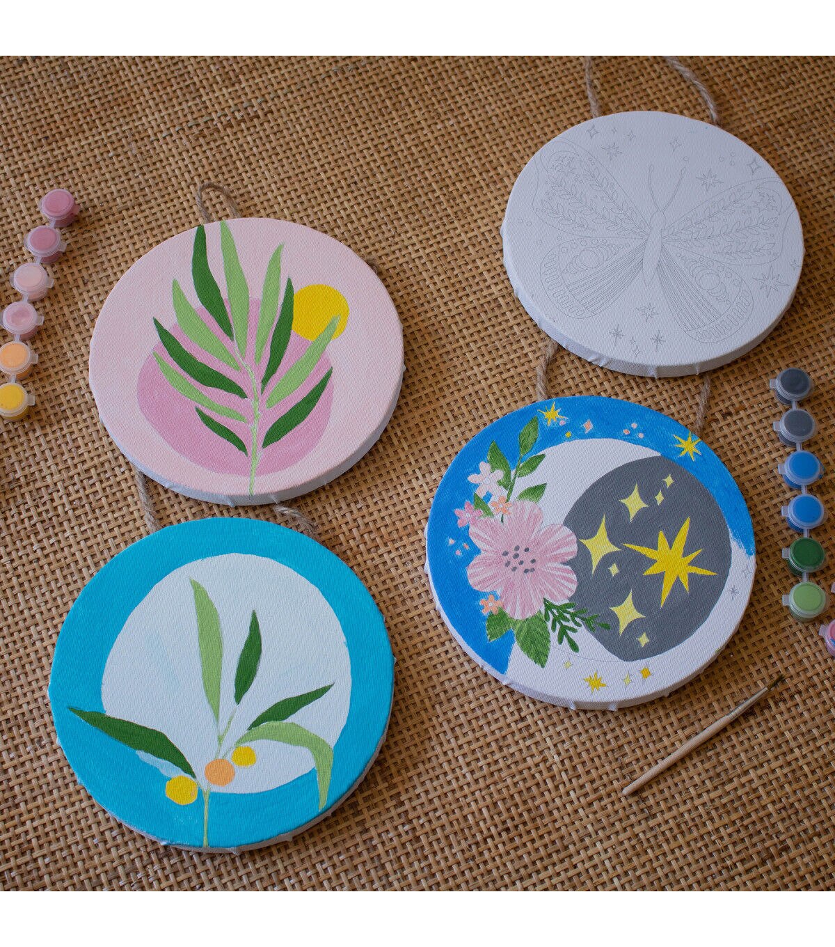Art 101 Gallery Paint and Hang Paintable Canvas Wall Art includes everything you need for the perfect piece of hanging art! This Two Pack comes with two designs, each with 2 circle canvases on rope with beautiful trendy designs for you to paint. This hanging canvas is the perfect addition to any room. Each canvas set includes 2 paint brushes and 12 bright and vibrant paint pods, for a total of 24 paint pods and 4 paint brushes. The possibilities are endless as you mix and match shades to create the perfect personalized design. A great creative activity for the experienced or beginner artist alike, you can choose to use our design inspiration or create your own!