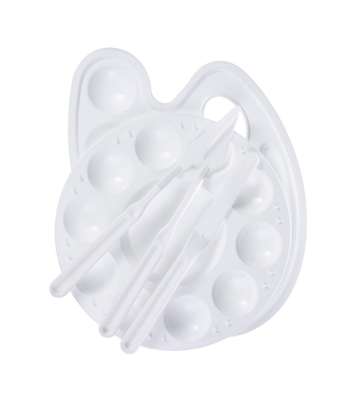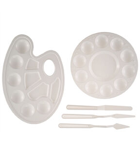 The perfect painting and paint mixing assortment. This convenient set includes a 10-well round palette, a 10-well oval palette, and three plastic painting knives.