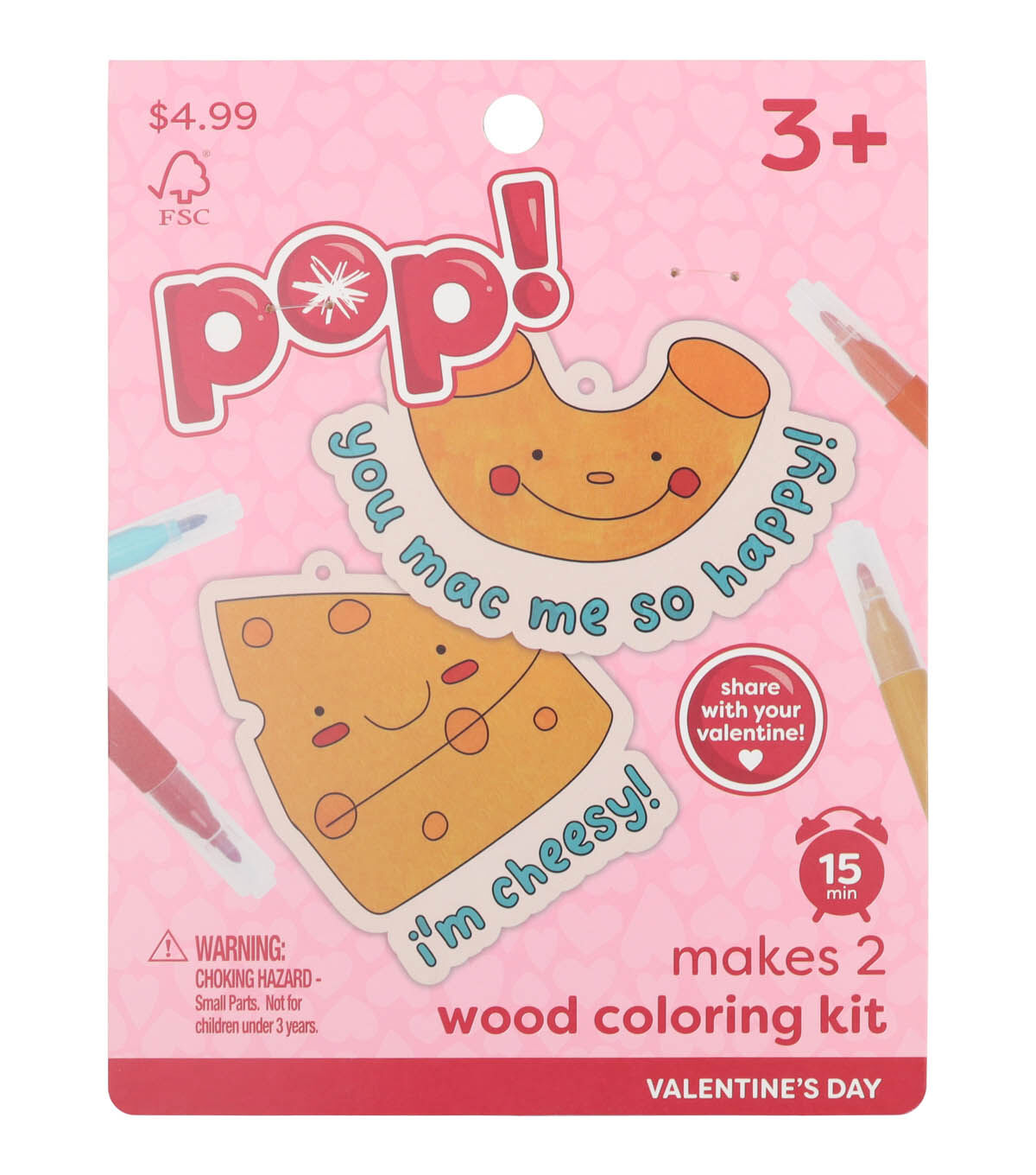 Keep your kids busy by adding the Valentine's Day Wood Mac & Cheese Buddie Coloring Kit by POP! to their crafting supplies. This pack includes coloring markers and unfinished wooden accents. One of the accents resembles a mac and flaunts the words ‘You Mac Me Happy’ and the other shaped like a cheese sports the words ‘I’m Cheesy.’ They can use the markers to color the wooden accent and add a string to display the finished version on a wall in their bedroom.