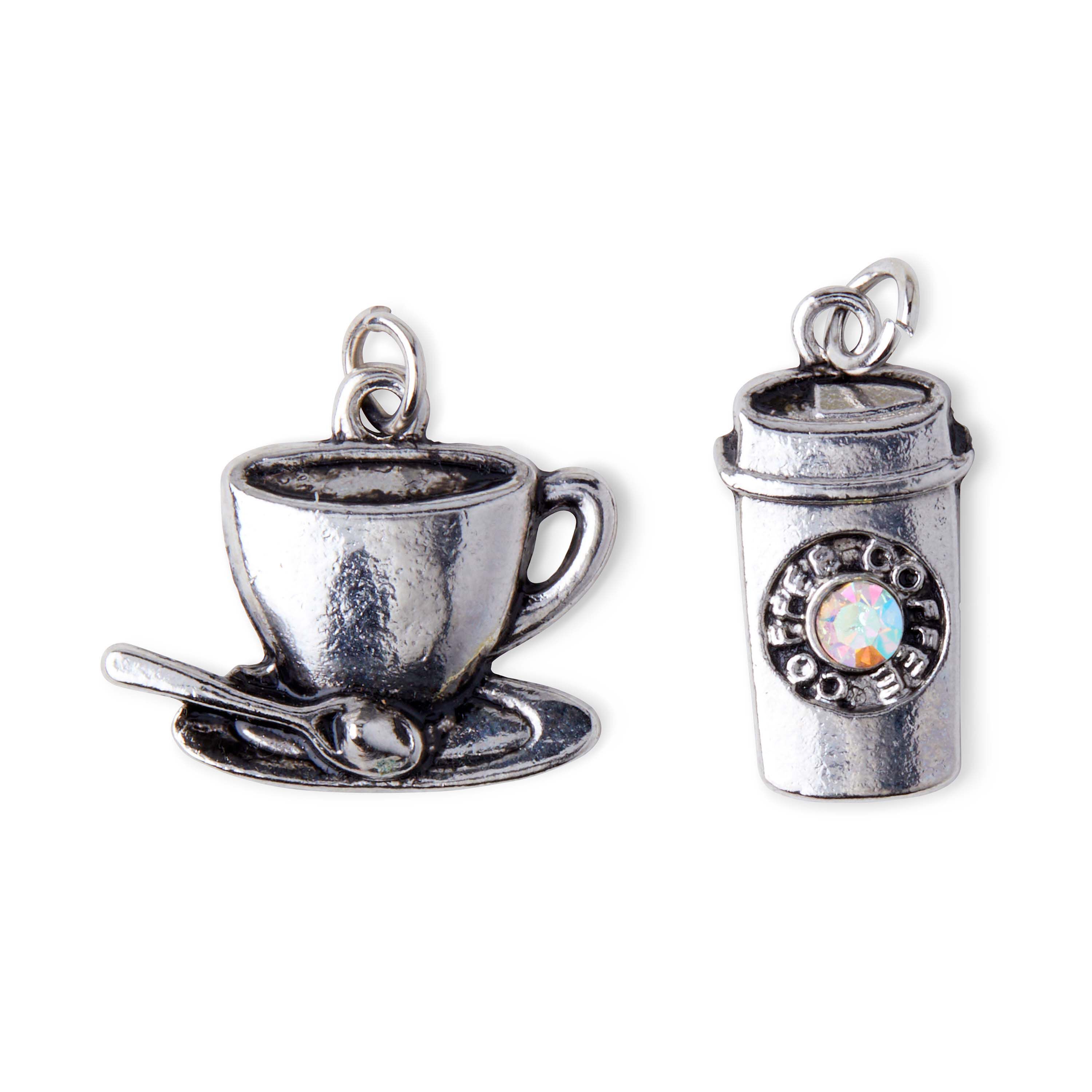 Personalize a DIY jewelry or craft project using these unique hildie & jo Coffee Charms-Silver. One of the charms is a coffee cup with a spoon resting on the saucer and the other is a to-go coffee cup. These coffee-themed silver charms have jump rings for easy attachment. Add these to bracelets, necklaces, keychains and more.