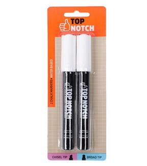 Get the Top Notch Broad & Chisel Tip Chalk Markers - White to create attractive chalkboard signs. This pack contains two white chalk markers that are designed with a broad or chisel tip. You can use them to make cute labels to organize your craft station or pantry. Make personalized tags for your friends by using these markers on chalkboard contact paper.