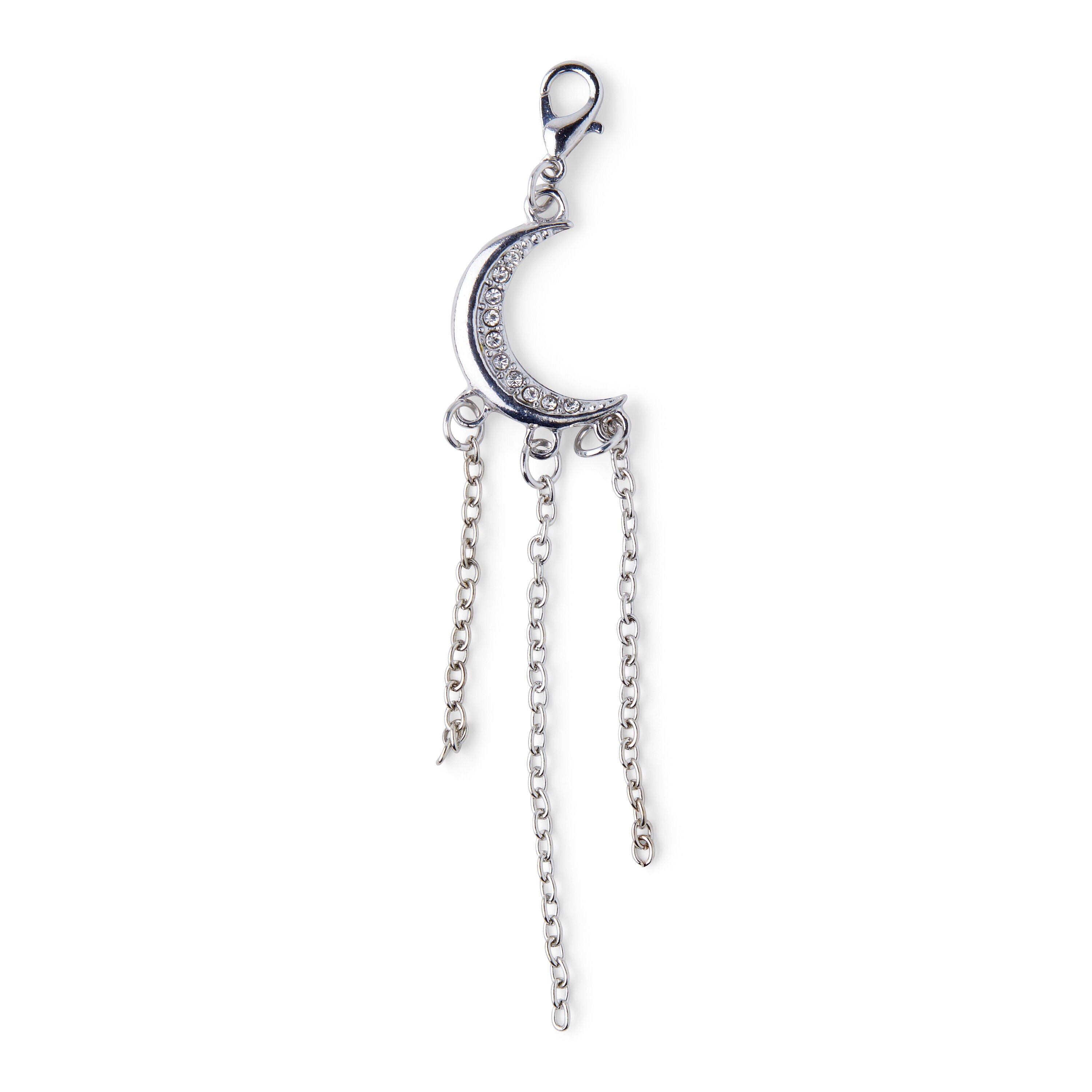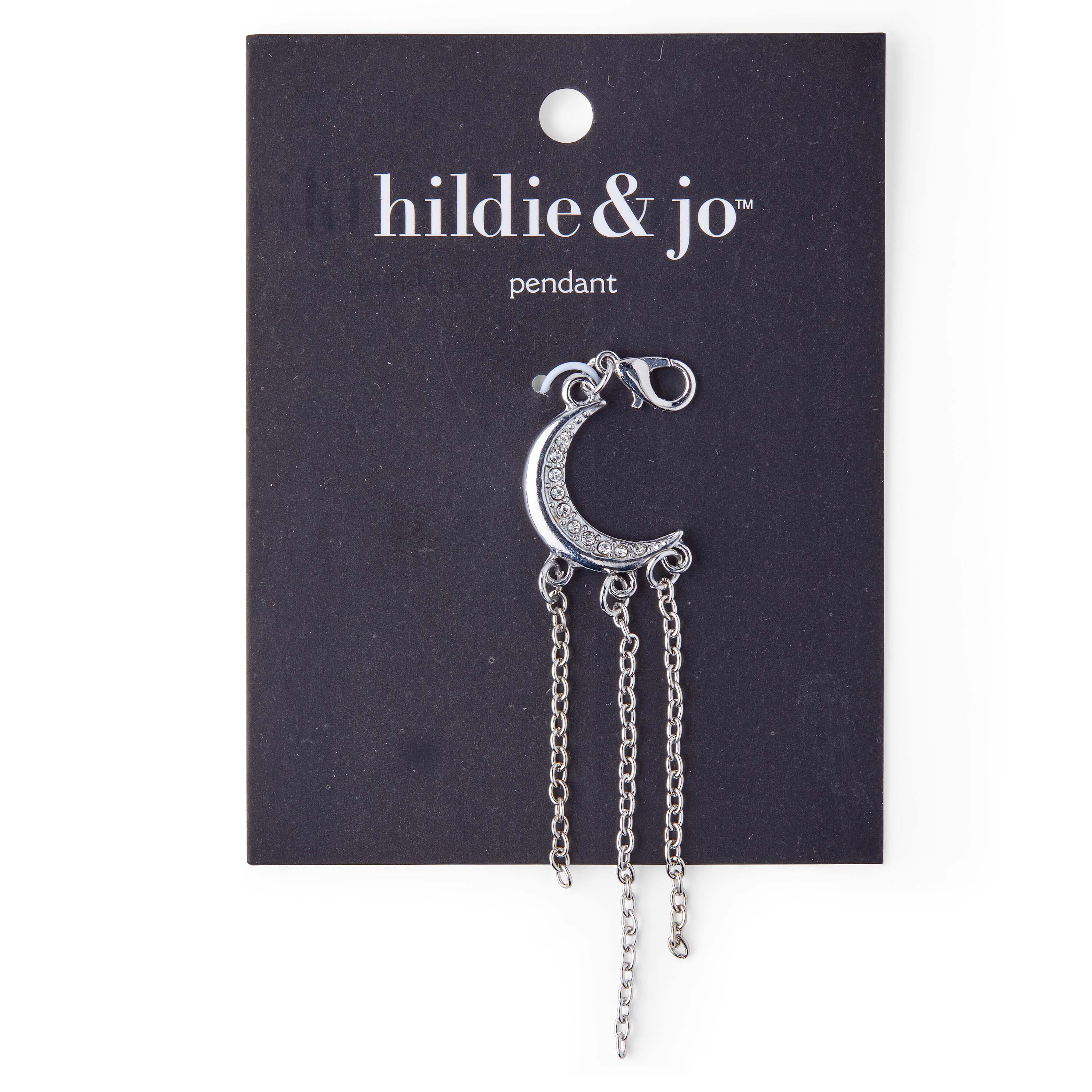 Add this beautiful hildie & jo Boulevard Crescent Silver Pendant with Chains-Clear Crystals to your craft kit for DIY jewelry projects. Designed in silver, the crescent has a smooth outer edge and small round crystals on the inner edge. There are three chains that dangle from the bottom of the crescent for added charm. String this lovely pendant on a matching chain to make a stylish necklace.