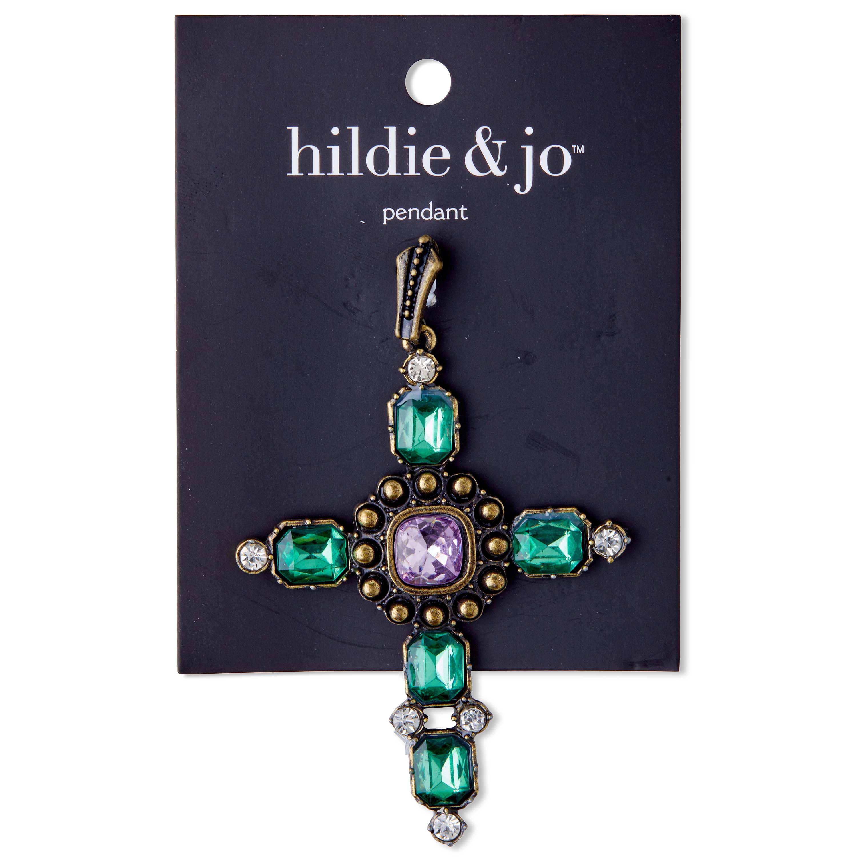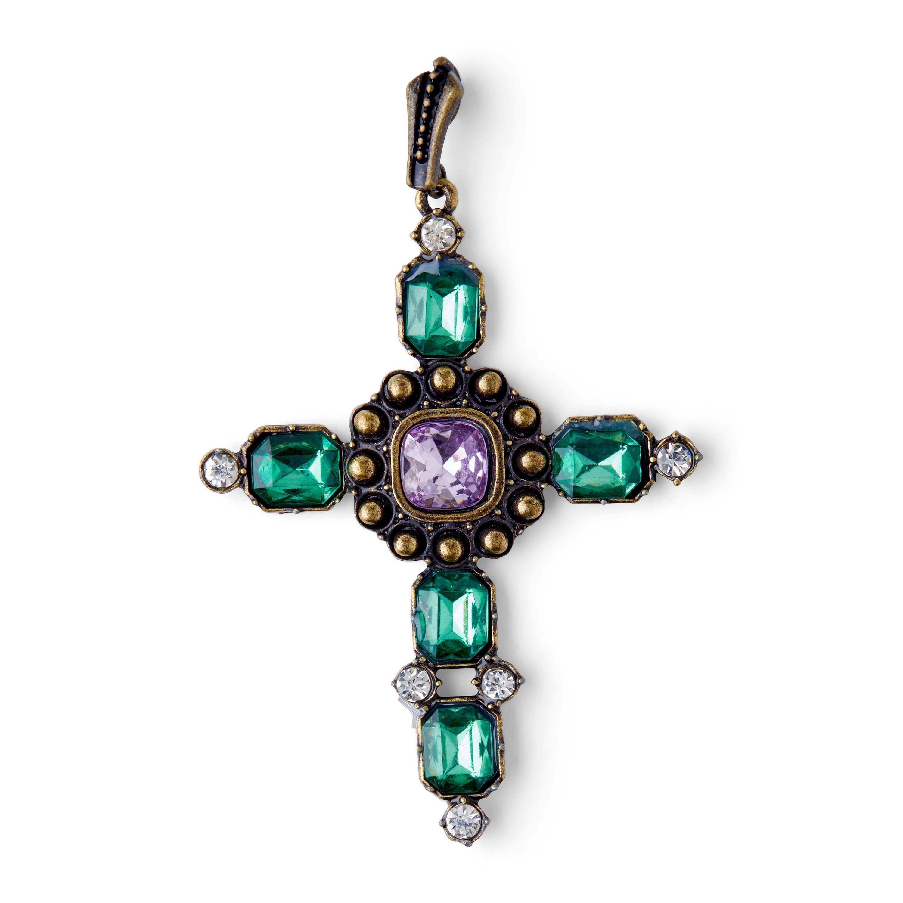 Lend an elegantly chic look to your favorite necklace using the hildie & jo Antiquist Cross Pendant-Green & Purple Stones. In antique gold, this cross features a bail on top with a line of dots down the center. The center of the accent is a square purple stone with rounded edges, which is beautifully surrounded by a round antique gold pattern. Each arm is a gorgeous green emerald cut stone with a round clear crystal the end. You can add this stunning pendant to any choker, backpack and more.