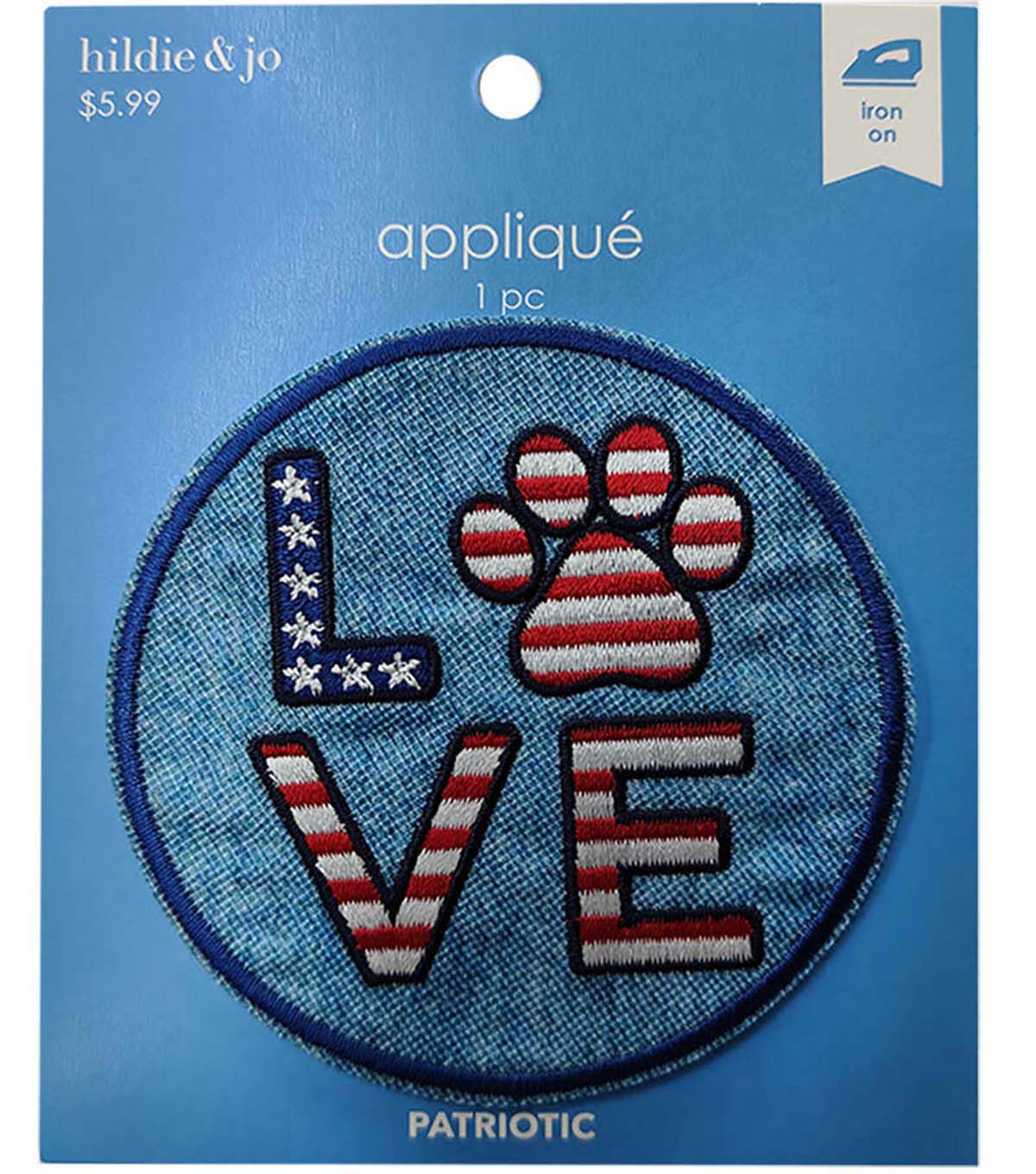 Add a Patriotic Touch to Your Outfit with the 3" Patriotic Denim Love Paw Iron On Applique by Hildie & Jo