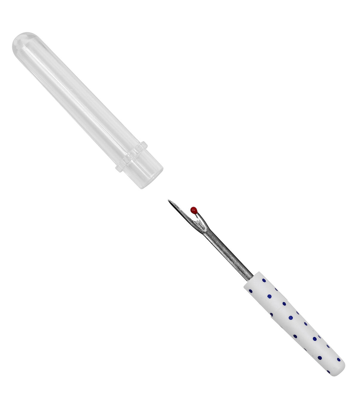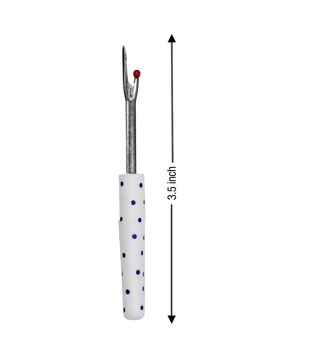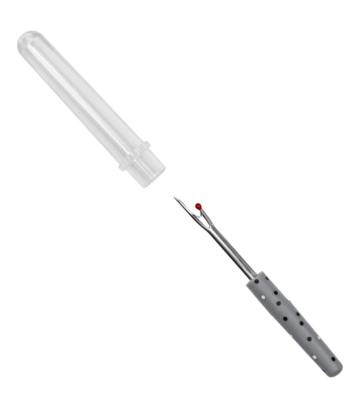 - Small handheld seam ripper easily removes stitches and labels without harming fabrics