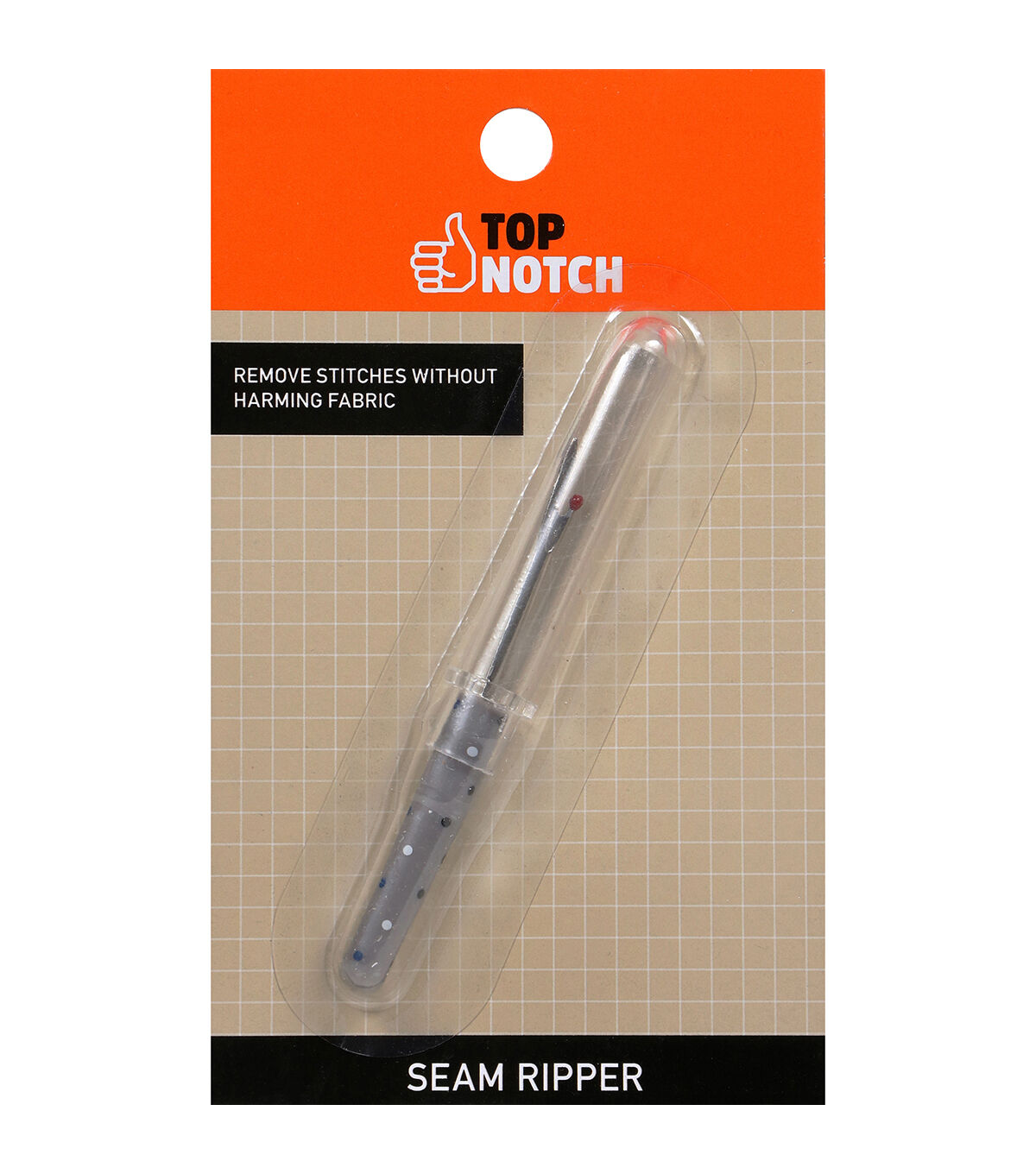 The Top Notch Small Seam Ripper is an essential sewing accessory for every sewist’s tool kit. Measuring 3” when capped, this small but sturdy seam ripper features a sharp two-pronged blade and a clear plastic cap that covers and protects the point when not in use, keeping the blade sharp and extending the life of the sewing tool. The seam cutter’s sharp fork-shaped blade is ideal for cutting threads, opening stitched buttonholes, picking stitches that need to be fixed, opening seams, as well as for removing buttons, snaps, and tags from clothing. The seam ripper comes with a red ball on one tip of the blade to prevent damage to the cloth around the stitches being removed. Its handle is easy to hold and maneuver, and it provides a sturdy, secure grip for repeated stitch removal. The Top Notch Small Seam Ripper is a must-have sewing tool for every seamstress’s sewing kit.