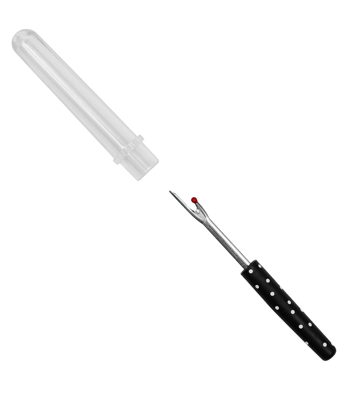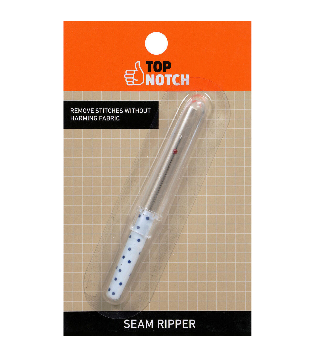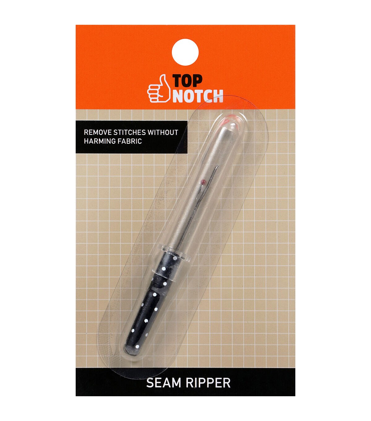 The Top Notch Small Seam Ripper is an essential sewing accessory for every sewist’s tool kit. Measuring 3” when capped, this small but sturdy seam ripper features a sharp two-pronged blade and a clear plastic cap that covers and protects the point when not in use, keeping the blade sharp and extending the life of the sewing tool. The seam cutter’s sharp fork-shaped blade is ideal for cutting threads, opening stitched buttonholes, picking stitches that need to be fixed, opening seams, as well as for removing buttons, snaps, and tags from clothing. The seam ripper comes with a red ball on one tip of the blade to prevent damage to the cloth around the stitches being removed. Its handle is easy to hold and maneuver, and it provides a sturdy, secure grip for repeated stitch removal. The Top Notch Small Seam Ripper is a must-have sewing tool for every seamstress’s sewing kit.
