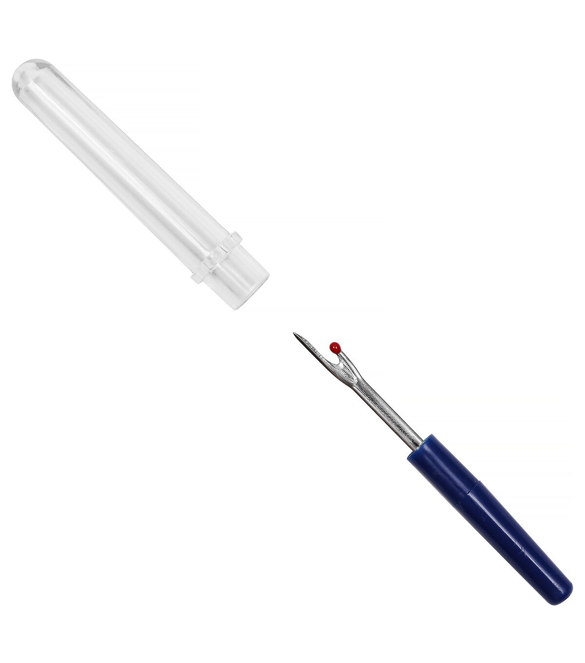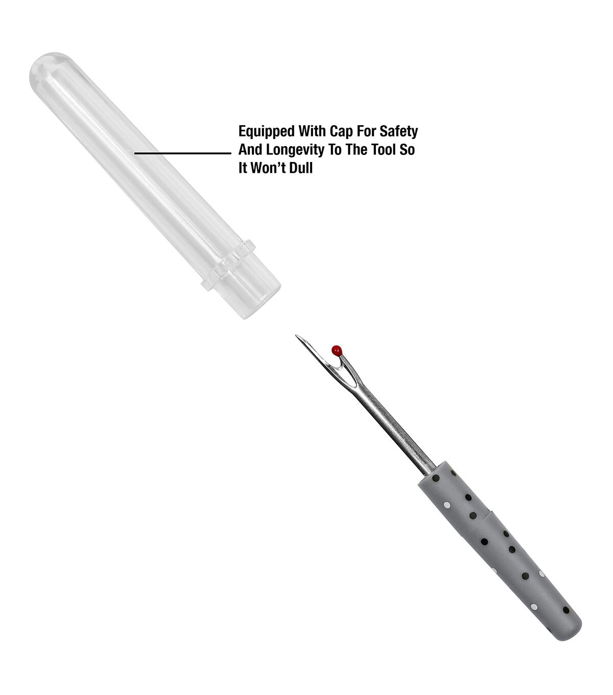 - Small handheld seam ripper easily removes stitches and labels without harming fabrics