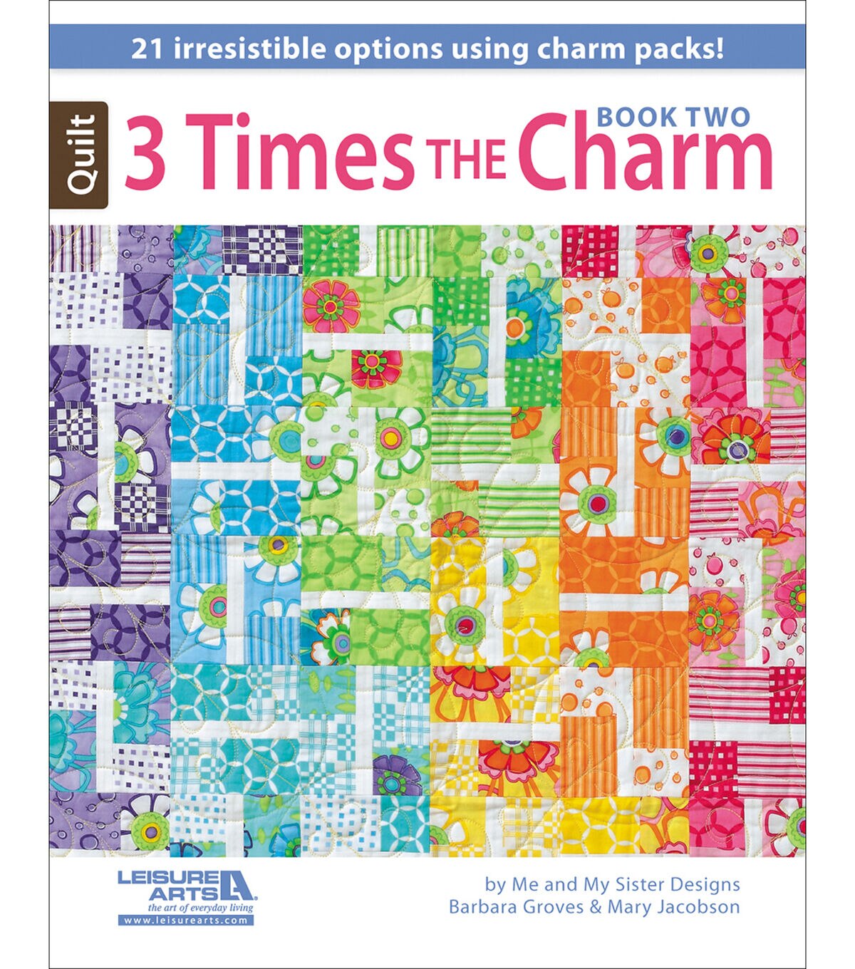 Leisure Arts-Three Times The Charm Book Two. Based on seven quilt designs, each design has been sewn in three colorful versions to inspire quilters to experiment with today's fun fabrics. Perfect for table toppers, wall hangings and baby shower gifts. This quilt collection showcases twenty-one small quilts created using precut charm packs of 5 inch squares. Authors: Barbara Groves and Mary Jacobson. Softcover, 40 pages. Published Year: 2013. ISBN 978-1- 4647-0660-8. Imported.