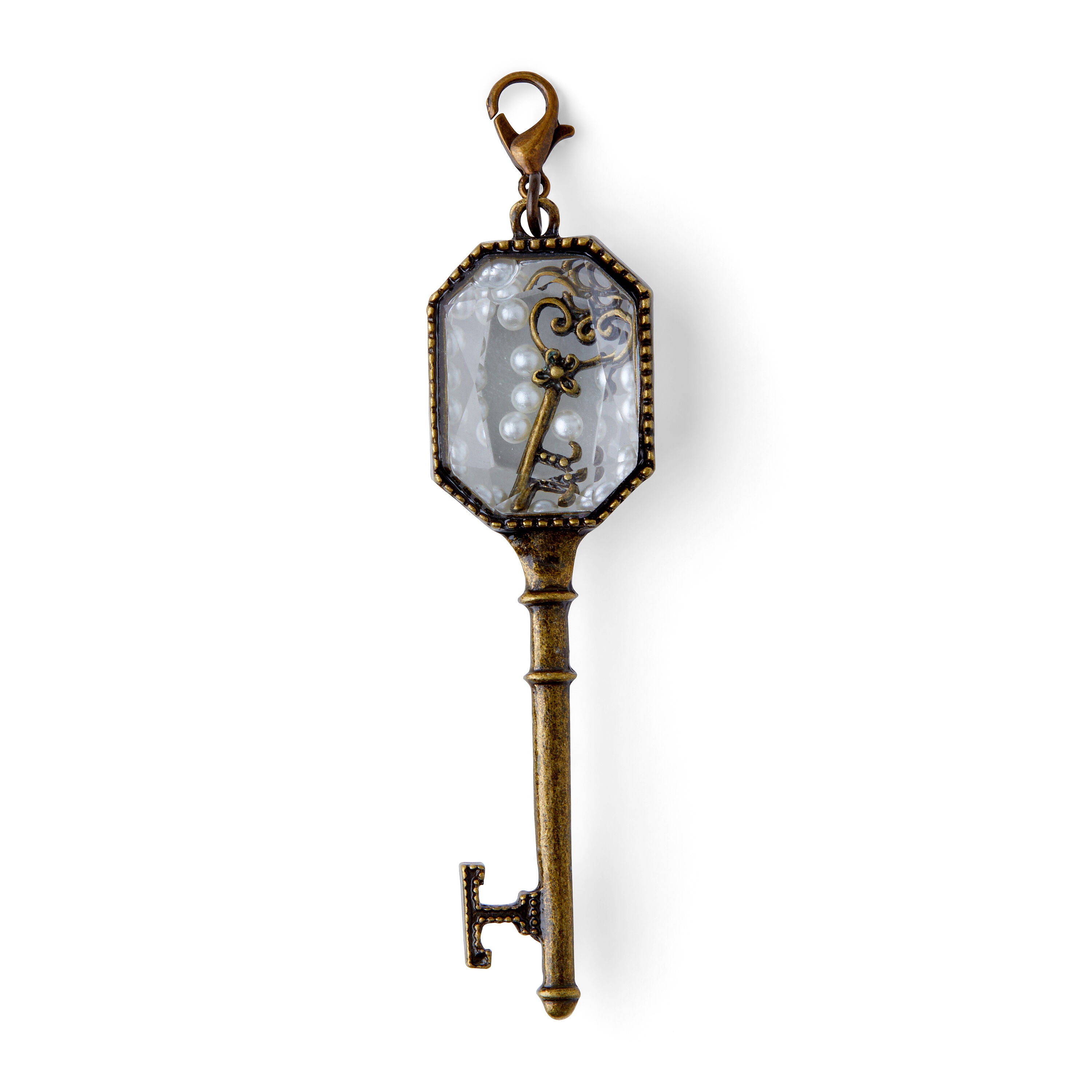Use the hildie & jo Ornamented Key Antique Gold Pendant-Crystal to draw attention to a plain outfit. Featuring a key shape, the pendant has a clear stone at the top filled with pearls and a very small key that highlights its charm. The clear stone is encased in antique gold with a dotted pattern and has a lobster clasp for easy attachment. Add it to bracelets, necklaces, key chains and more.