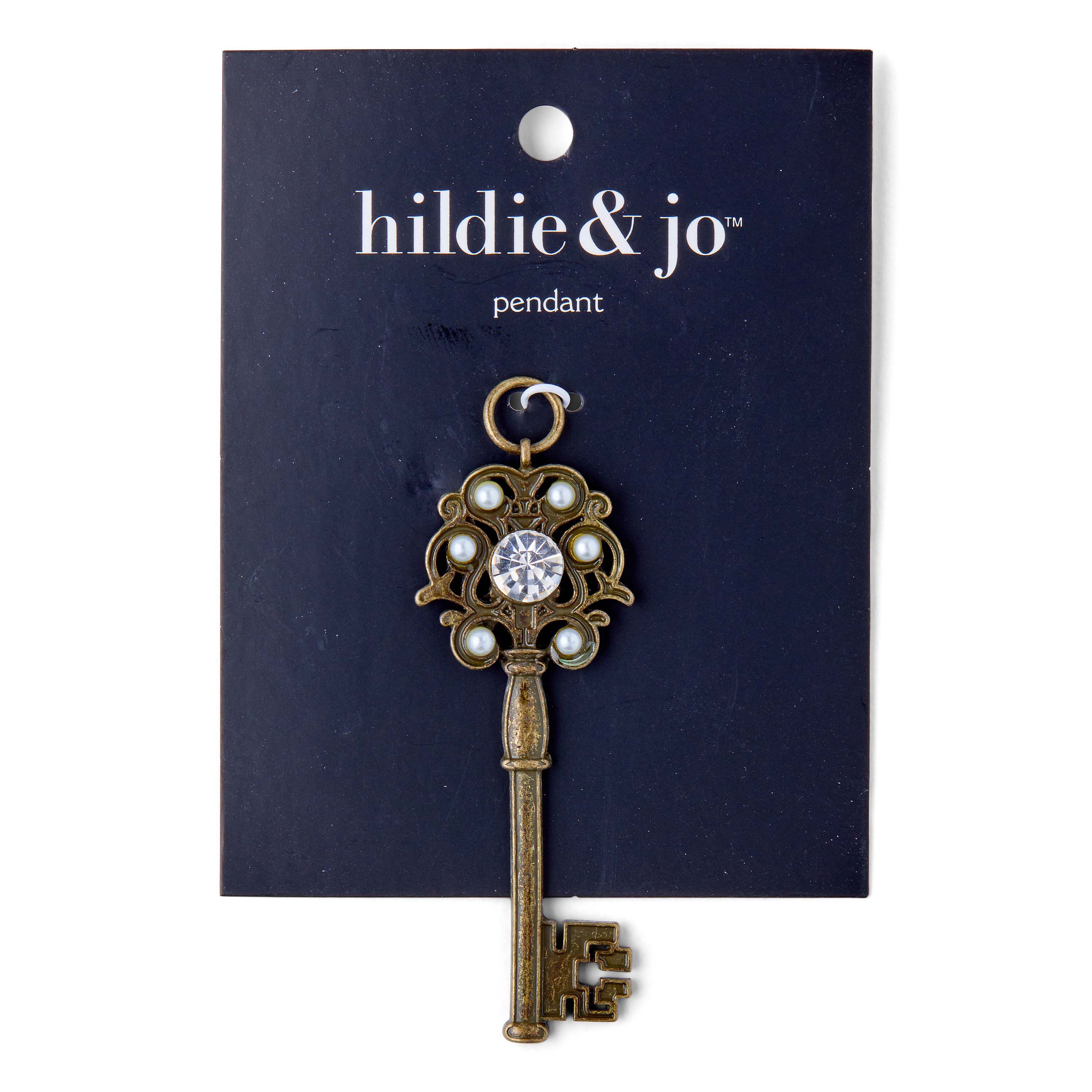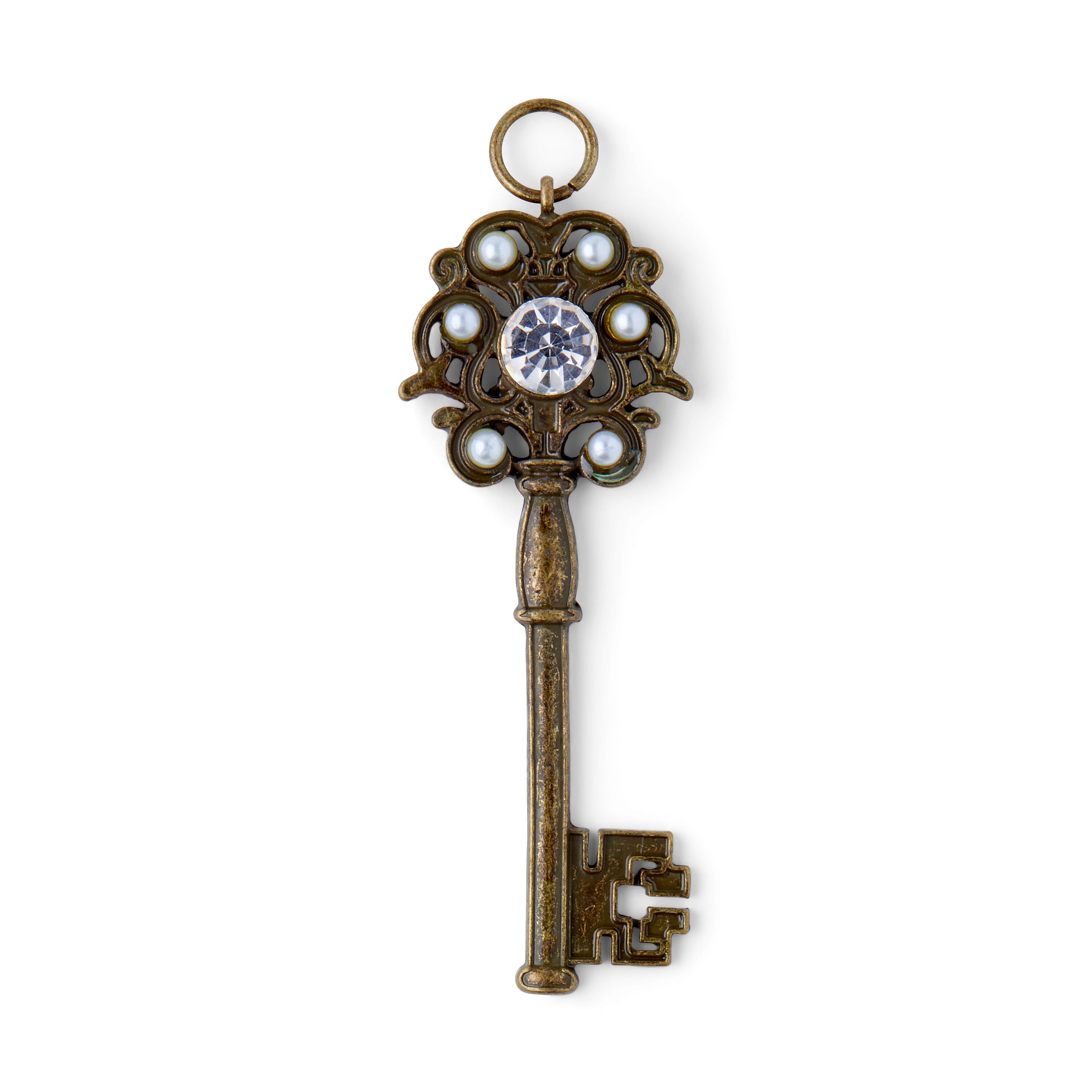 Accentuate your necklace with the hildie & jo Ornamented Key Antique Gold Pendant-Crystal & Pearls. The key pendant is designed using a scroll pattern with a large, round clear crystal in the center and six small pearls nested around in the scroll. You can add it to bracelets, necklaces, key chains and more using a jump ring.