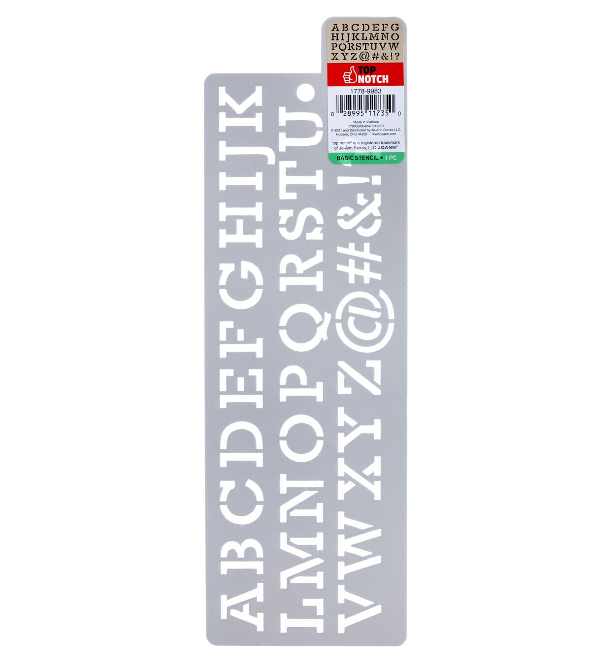 Stencil letters easily with the Top Notch Block Letter Stencil Sheet. This sheet of letters allows the crafter to create any word or phrase for added personalization to a project. Durable and reusable, this plastic stencil sheet is easy to clean up with mild soap and warm water. Add the Top Notch Block Letter Stencil Sheet to your stencil collection for a set of letters that are versatile and simple.Stencil letters easily with the Top Notch Block Letter Stencil Sheet. This sheet of letters allows the crafter to create any word or phrase for added personalization to a project. Durable and reusable, this plastic stencil sheet is easy to clean up with mild soap and warm water. Add the Top Notch Block Letter Stencil Sheet to your stencil collection for a set of letters that are versatile and simple.