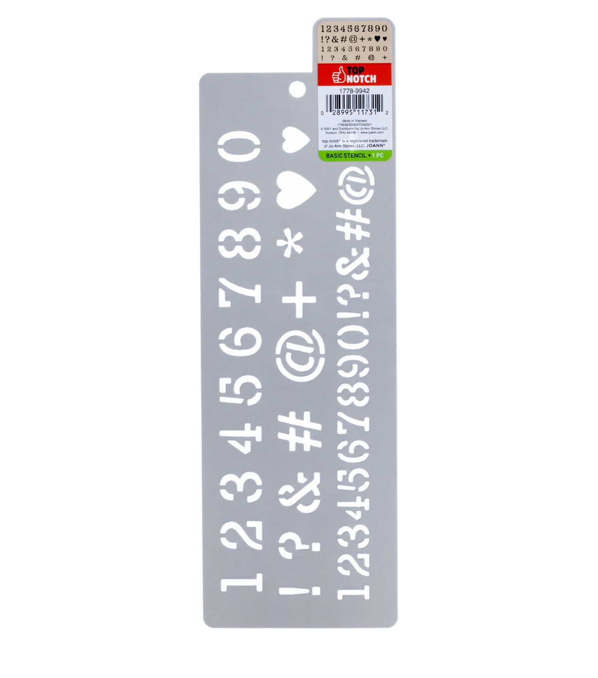 Stencil a set of numbers easily with the Top Notch Number Block Stencil Sheet. This simple sheet of numbers and symbols is the perfect addition to any crafter's stencil collection. Durable and reusable, this plastic stencil sheet is easy to clean up with mild soap and warm water. Add the Top Notch Number Block Stencil Sheet to your crafting essentials for added versatility to your projects. Stencil a set of numbers easily with the Top Notch Number Block Stencil Sheet. This simple sheet of numbers and symbols is the perfect addition to any crafter's stencil collection. Durable and reusable, this plastic stencil sheet is easy to clean up with mild soap and warm water. Add the Top Notch Number Block Stencil Sheet to your crafting essentials for added versatility to your projects.