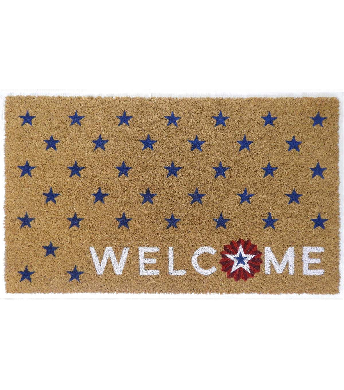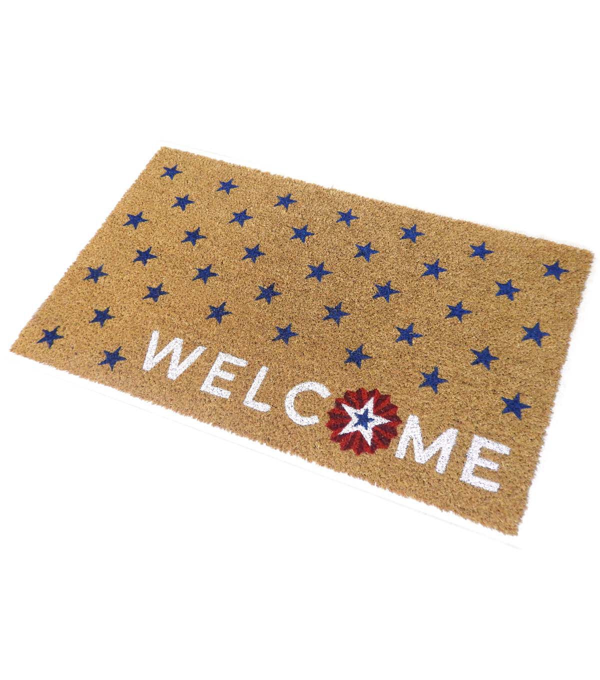 Make a Patriotic Statement with the 30" x 18" Patriotic Welcome With Blue Stars Coir Doormat by Place & Time
