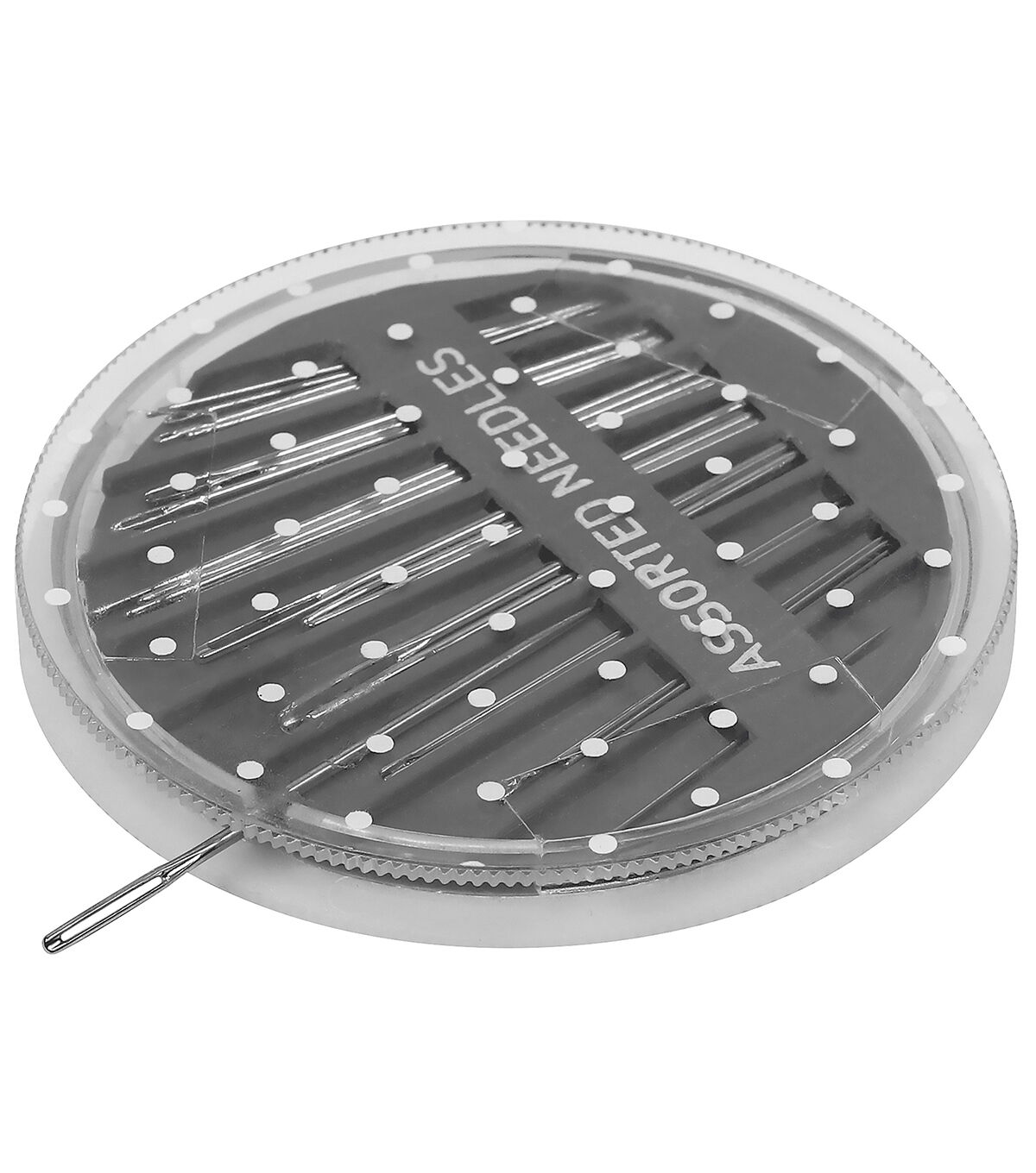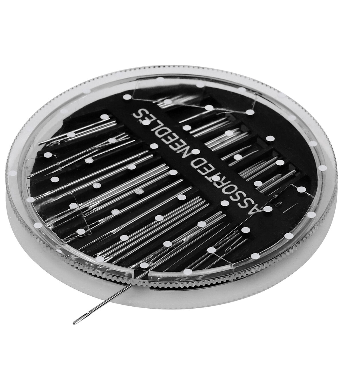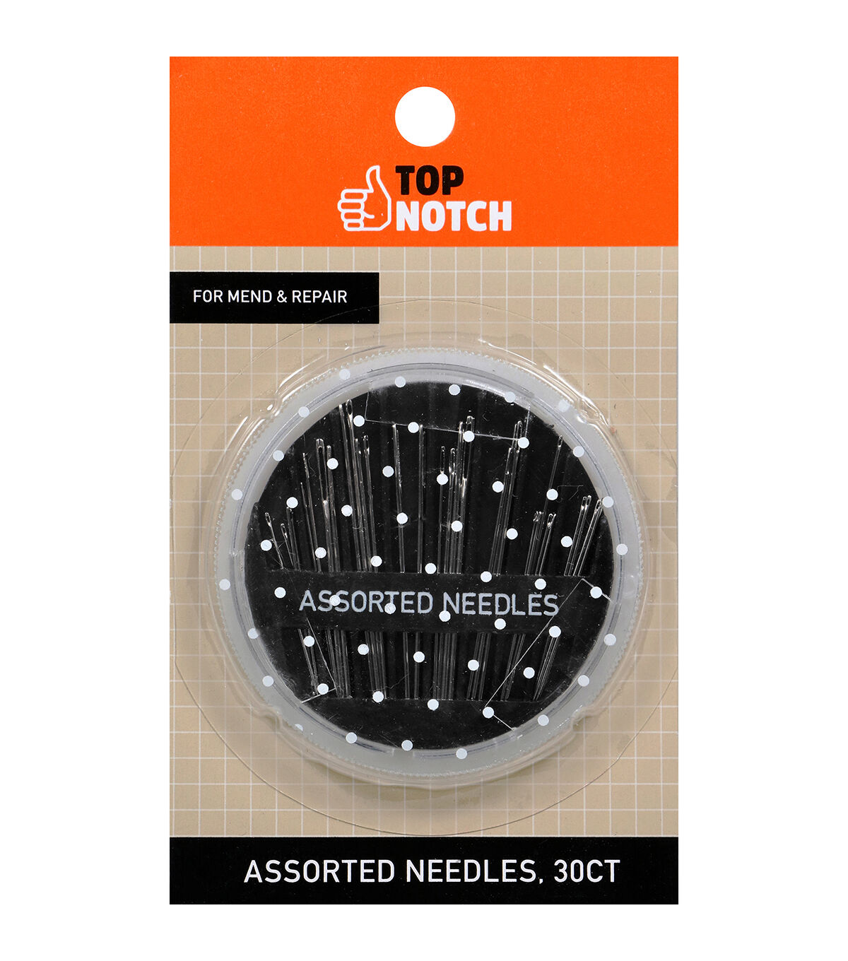 - The Top Notch Assorted Hand Needles Set in is a durable plastic compact that comes with a set of 30 assorted hand sewing needles in various sizes and styles. The handy compact case is created with the organized seamstress in mind, including an assortment of darners, between, sharps, and embroidery needles.This attractive and functional compact is innovatively created with a dial-a-needle design. Simply position the circle over the desired compartment and select the needle you need. Made from strong nickel-plated steel, these needles are sharp and rust-resistant for long term use. They should be kept away from children. This assortment is ideal for mending seams, sewing buttons, repairing torn garments, hemming skirts and trousers, embroidery, and other hand sewing projects. This versatile and organized needle set is a great addition to any seamstress’s sewing kit, and it can also be used as a convenient hand sewing compact to throw in your bag for quick mending projects on the go.